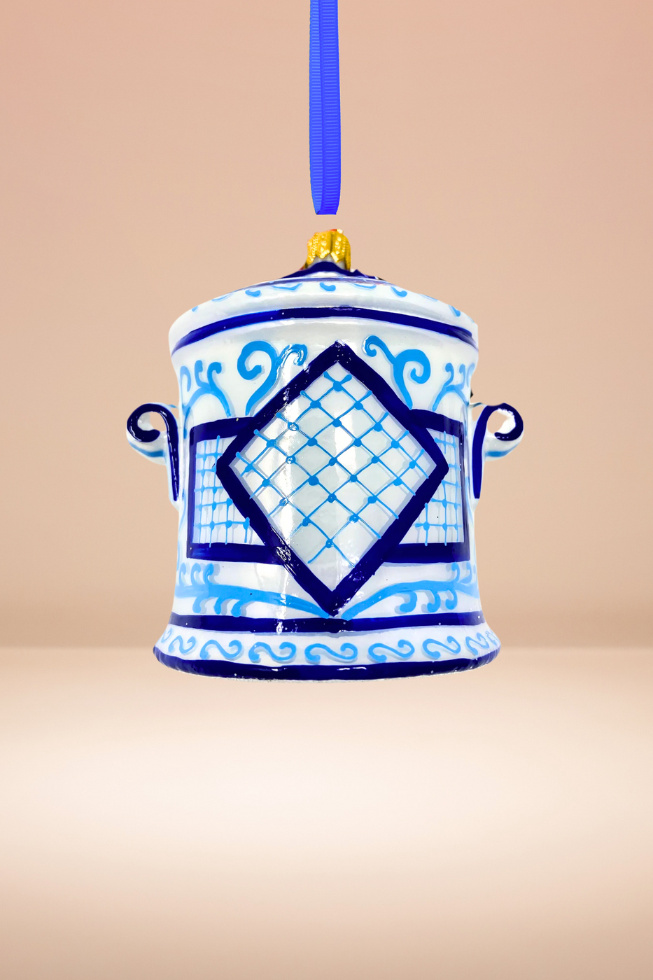 The DeSantis Cookie Jar Ornament is a study in classic Italian ceramics, where delicate cobalt patterns meet soft ivory curves. Inspired by seaside villas and sun-drenched piazzas, its intricate latticework and scrolling motifs evoke the timeless beauty of hand-painted majolica.