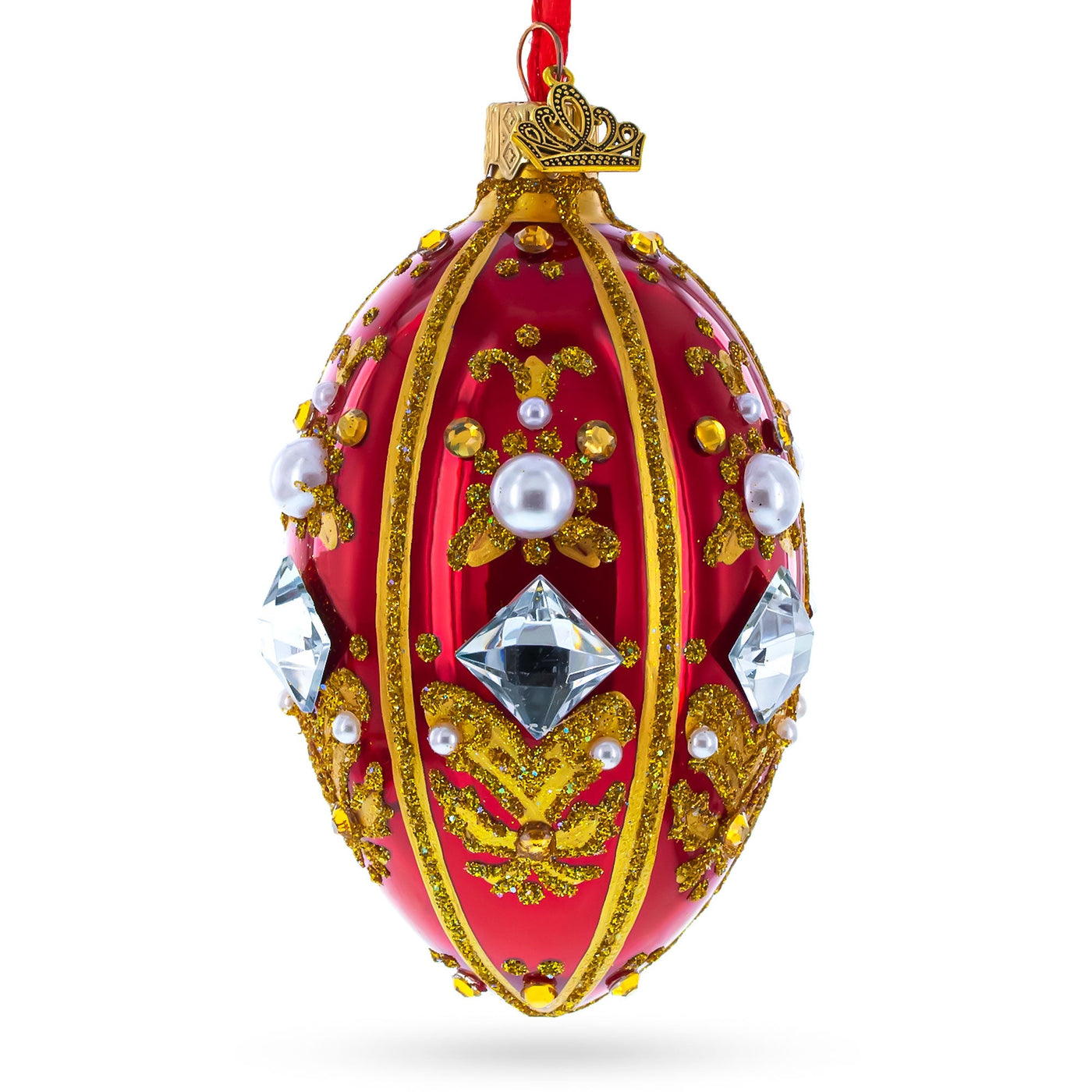 Diamonds and Pearls on Red Glass Egg Ornament 4 Inches
