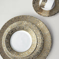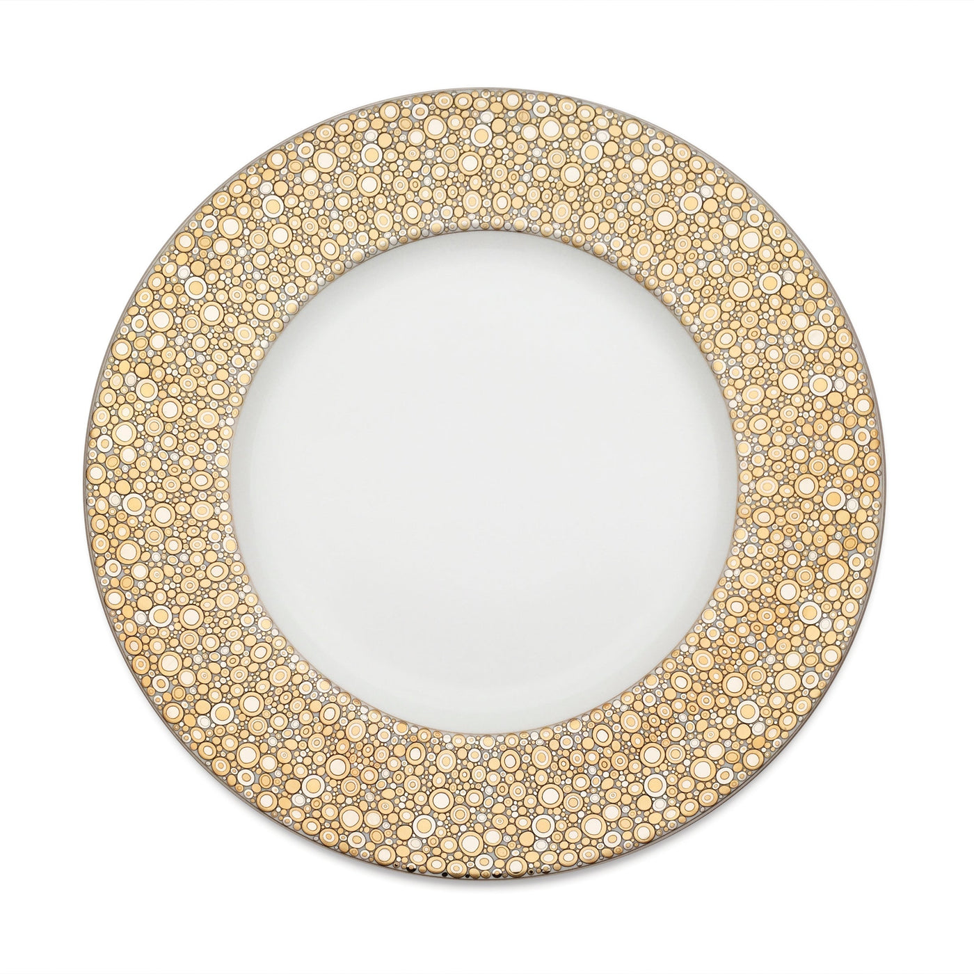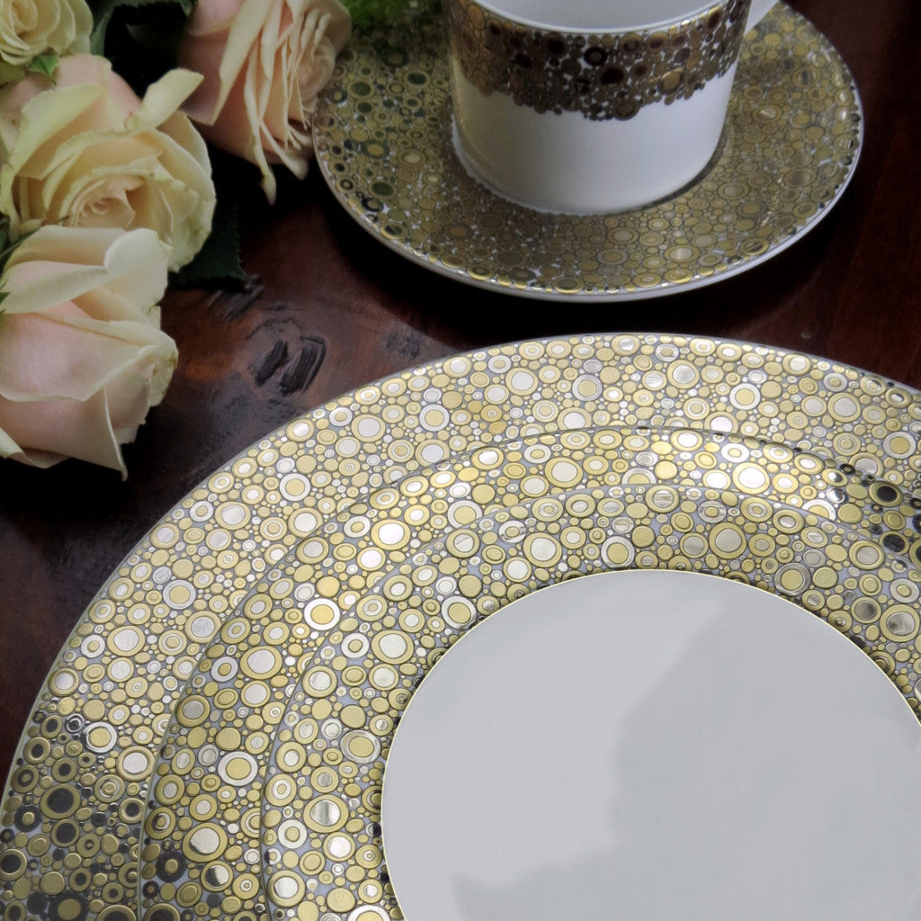 Ellington Shimmer merges random notes of gold and platinum to create an elegant harmony from a wide range of textures in matte and bright metals. Decorated on creamy white bone china, this full-bordered plate playfully reflects the light at any angle.