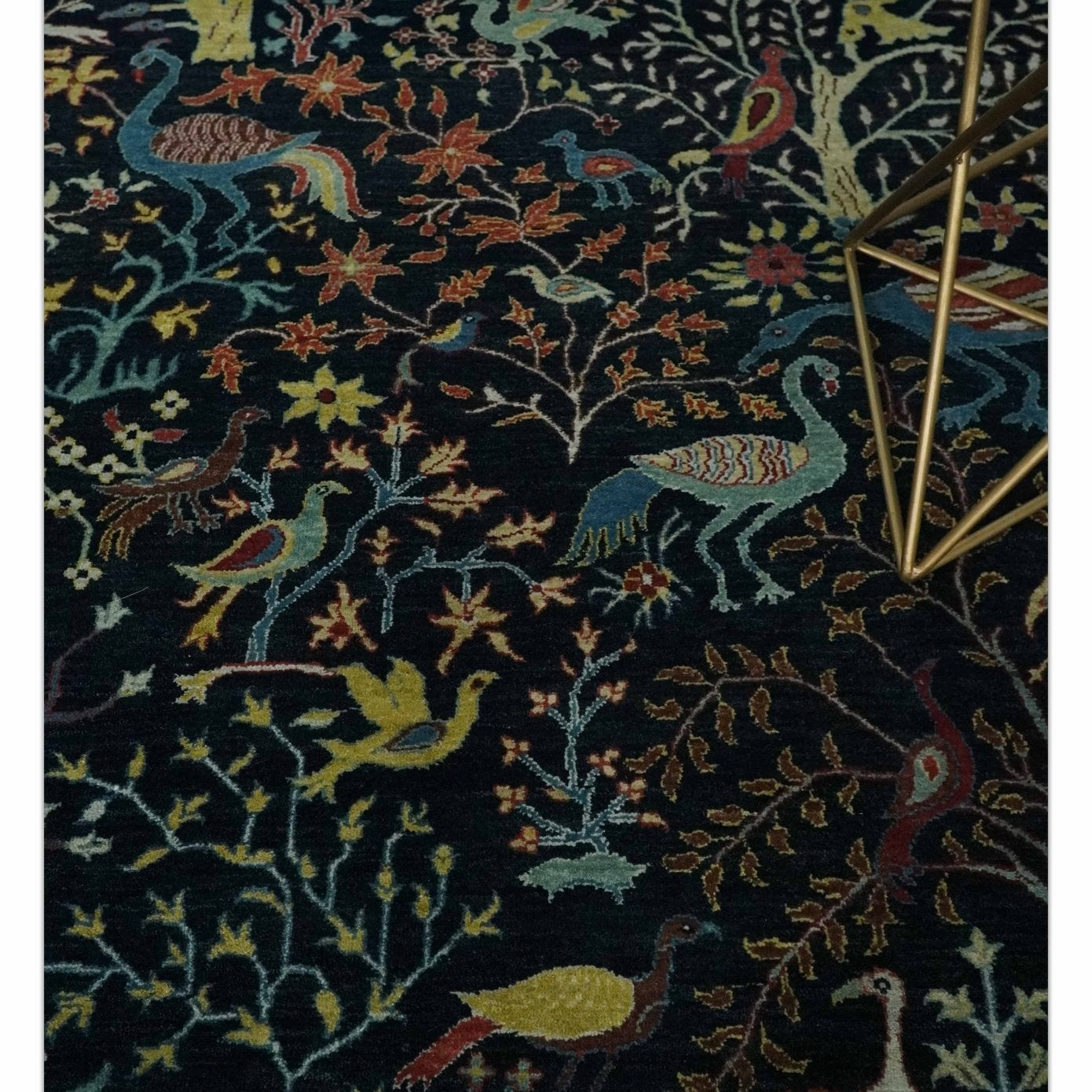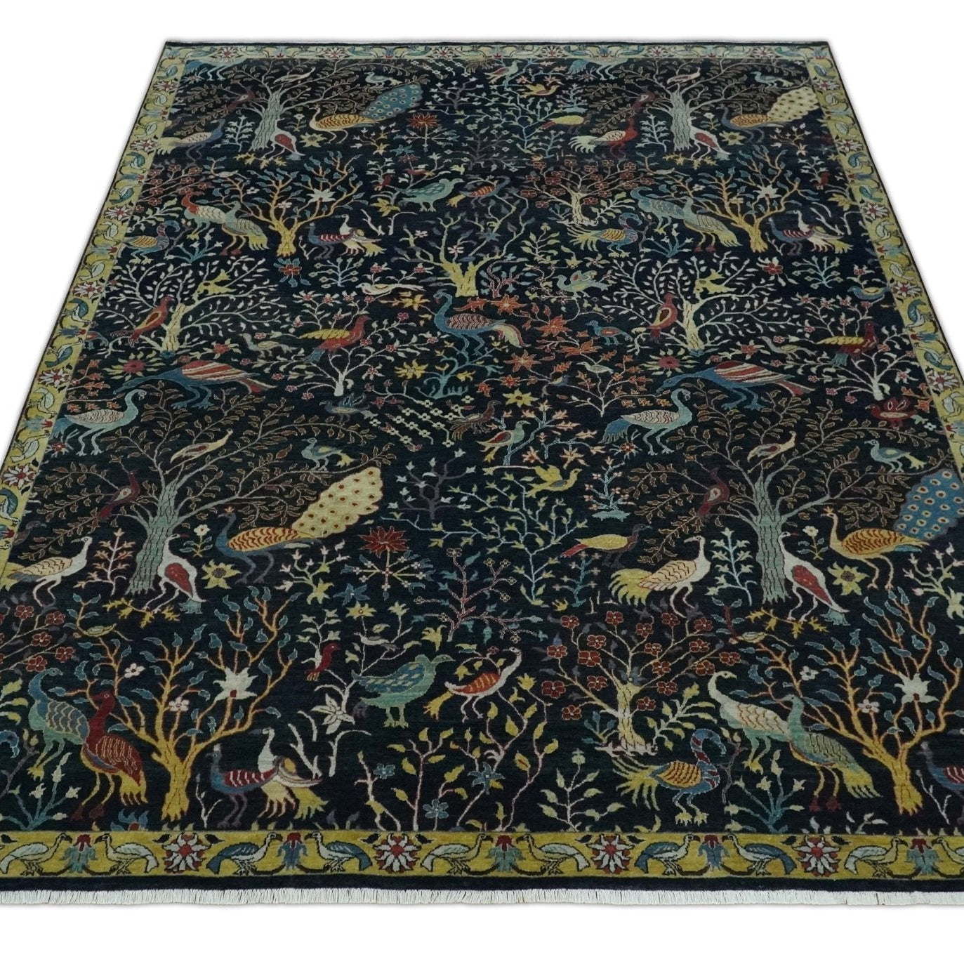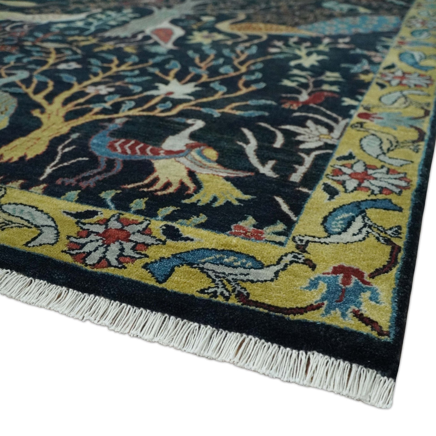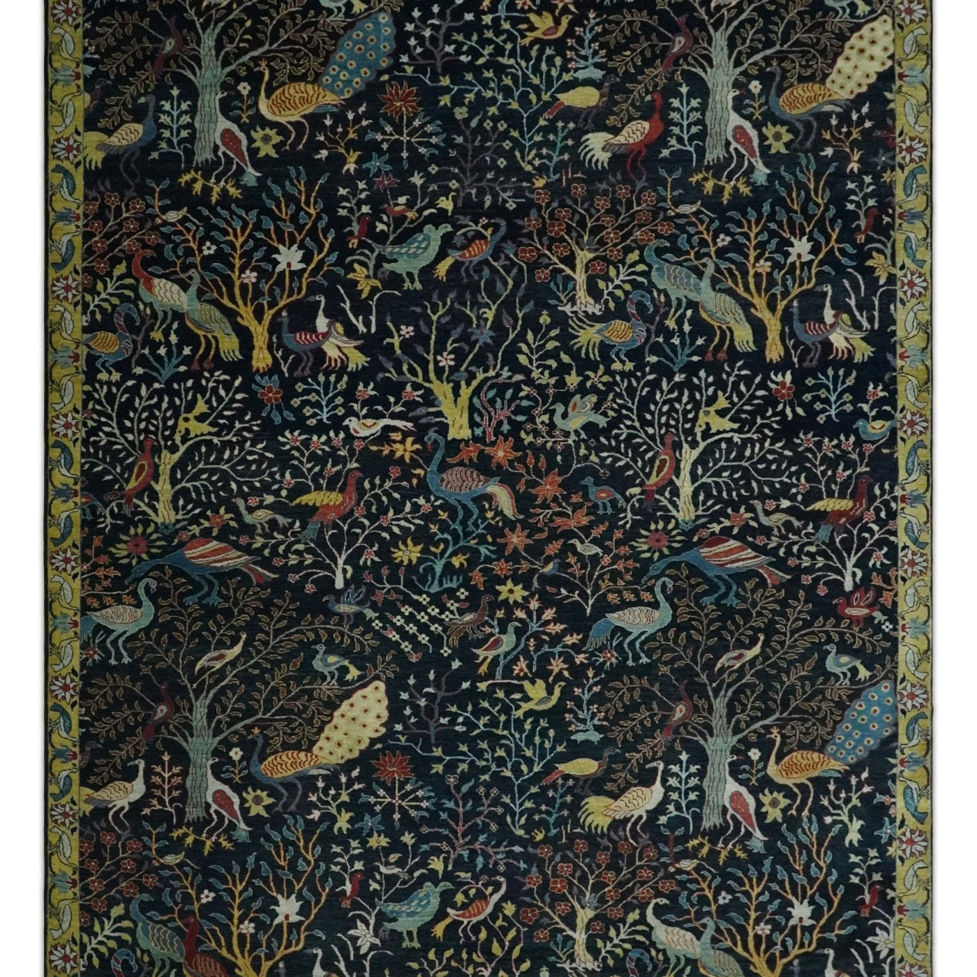 - Fine The Jungle Life Peacock on tree Rug 8x10, 9x12 Hand Knotted Black and Mustard Wool Rug