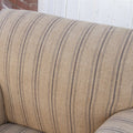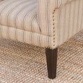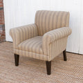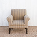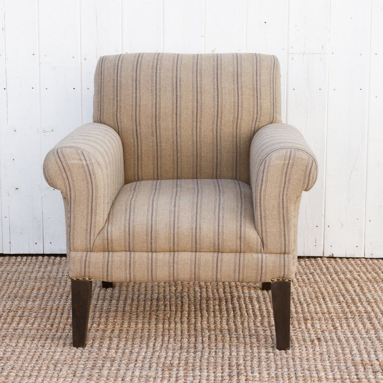 This Bergere club chair is a modern interpretation of a French classic. The solid wood base has a bleached and sealed finish with added comfort of a generous seat and winged sides. This bergère club chair is ideal as a conversational piece and lounging with a book in hand. Featuring a classic taupe striped handloom fabric, giving it grace and a pop of color to your living room.