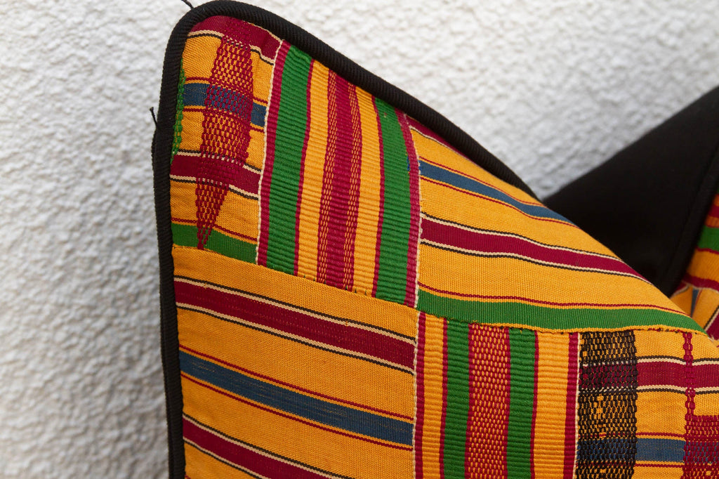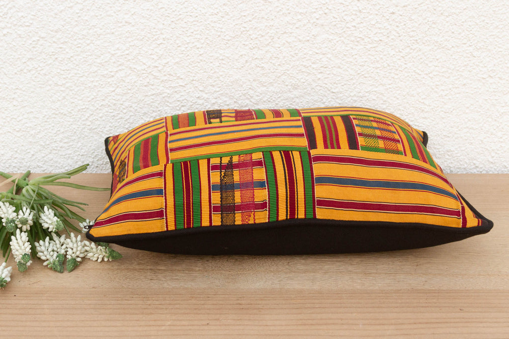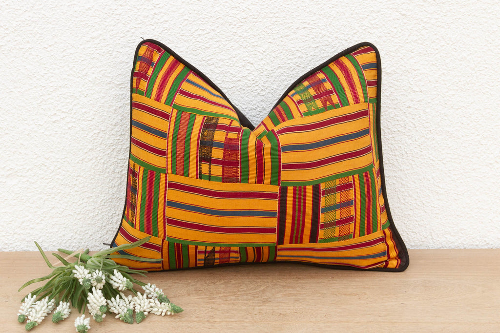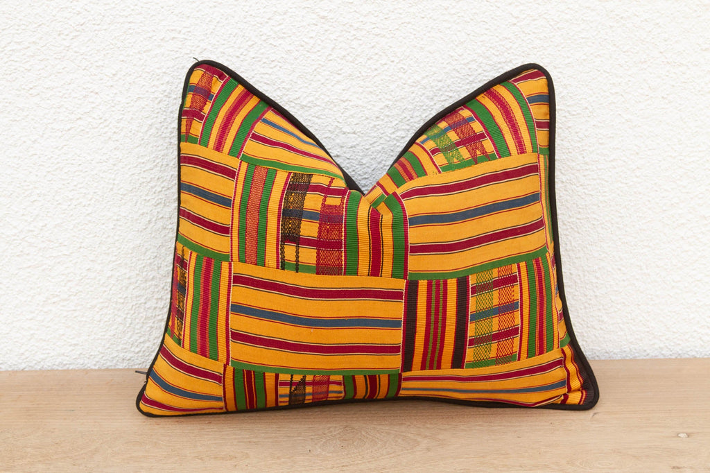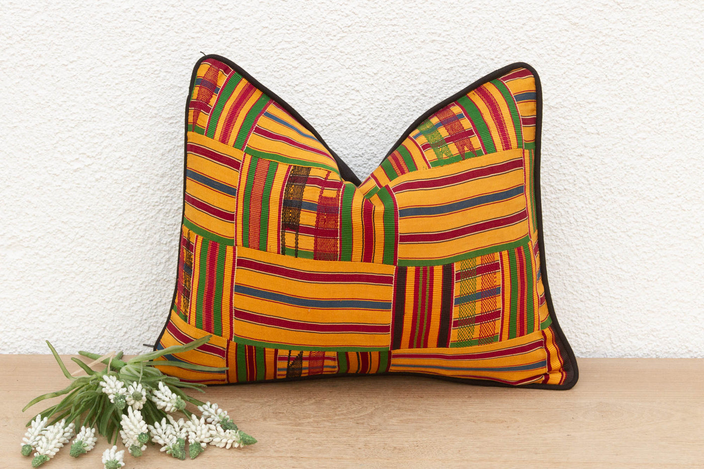 Add a pop of color and history to your home with a touch of African artistry with this captivating vintage kente pillow. Hand-woven by the Asante people of Ghana, the pillow features a vibrant geometric kente cloth, where each color traditionally holds a special meaning. This unique pillow is made from a vintage Kente cloth, showcasing the traditional strip-weave construction, a testament to the skills passed down through generations of Ghanaian artisans. This decorative African throw pillow has cotton back and piping contrasting with the traditional front.