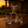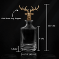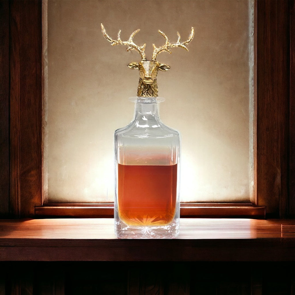 Designed in brass with a gold finish, a majestic deer proudly sits on the large crystal clear decanter.
