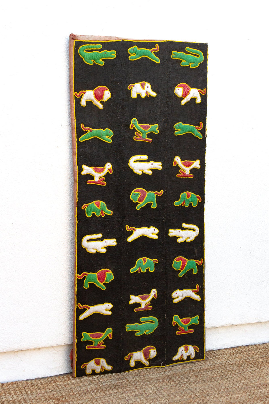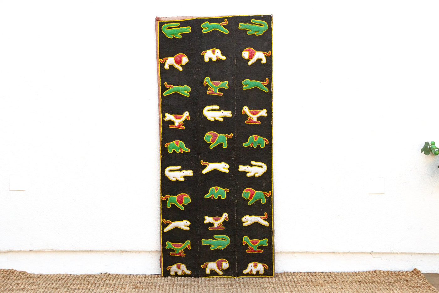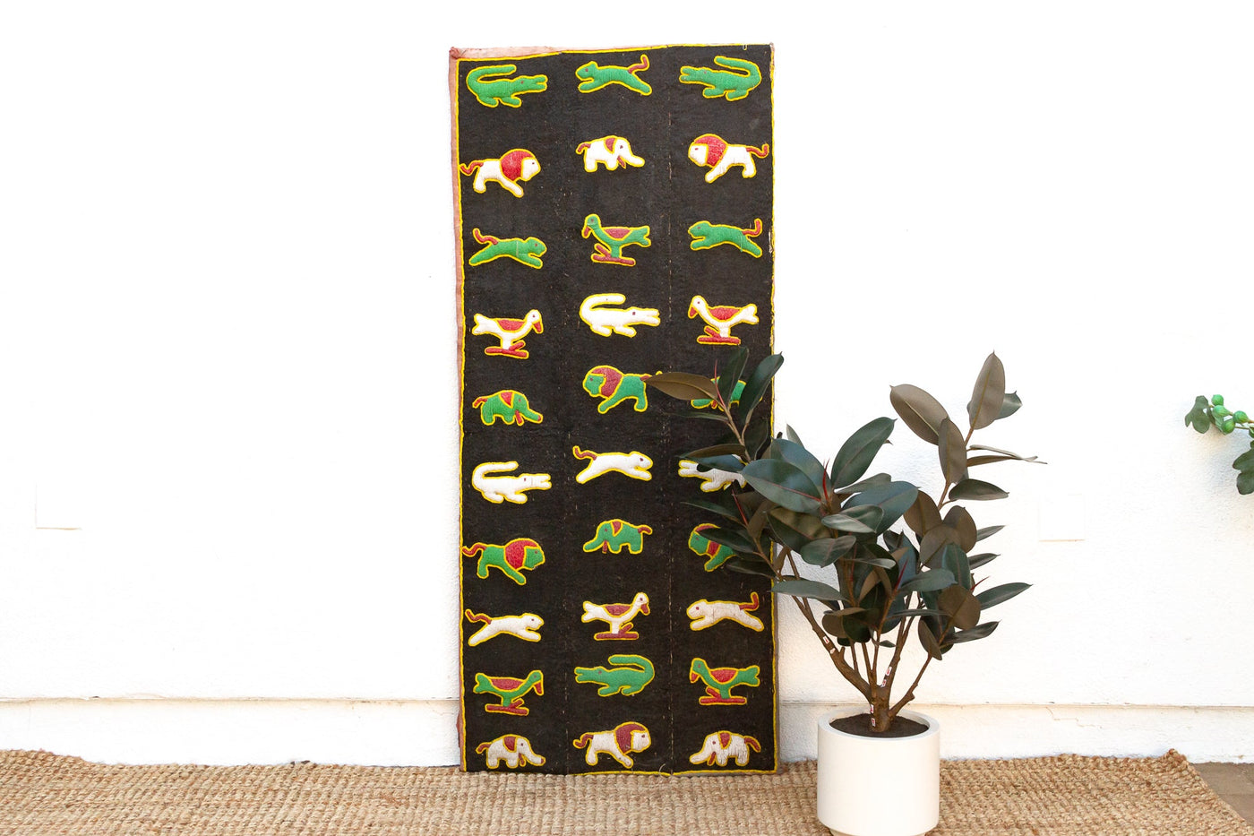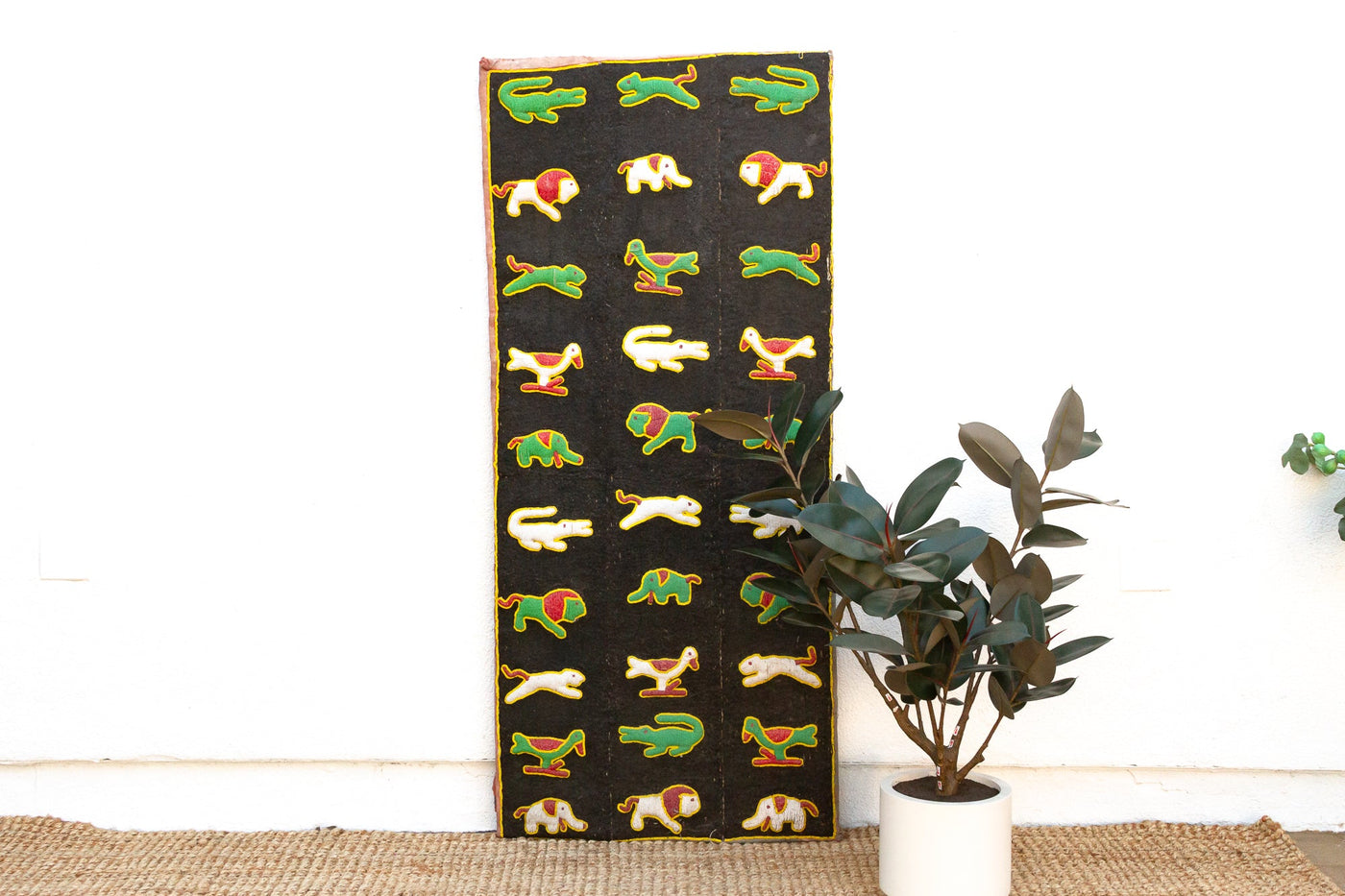 Embark on a Visual Safari with this Beaded Wall Panel: This impressive vintage beaded wall panel, standing tall at 70 inches, invites you on a visual safari through the African savanna. A vibrant menagerie of animals — lions, elephants, crocodiles, birds — is meticulously rendered in colorful beads against a dramatic black backdrop. This captivating tapestry, handcrafted with intricate detail, celebrates the rich biodiversity and cultural heritage of Africa. Imagine it as a striking focal point in your living room, a conversation starter in your dining room, or a unique addition to your bedroom décor. This beaded masterpiece is sure to infuse your space with a touch of global charm and artistic wonder.