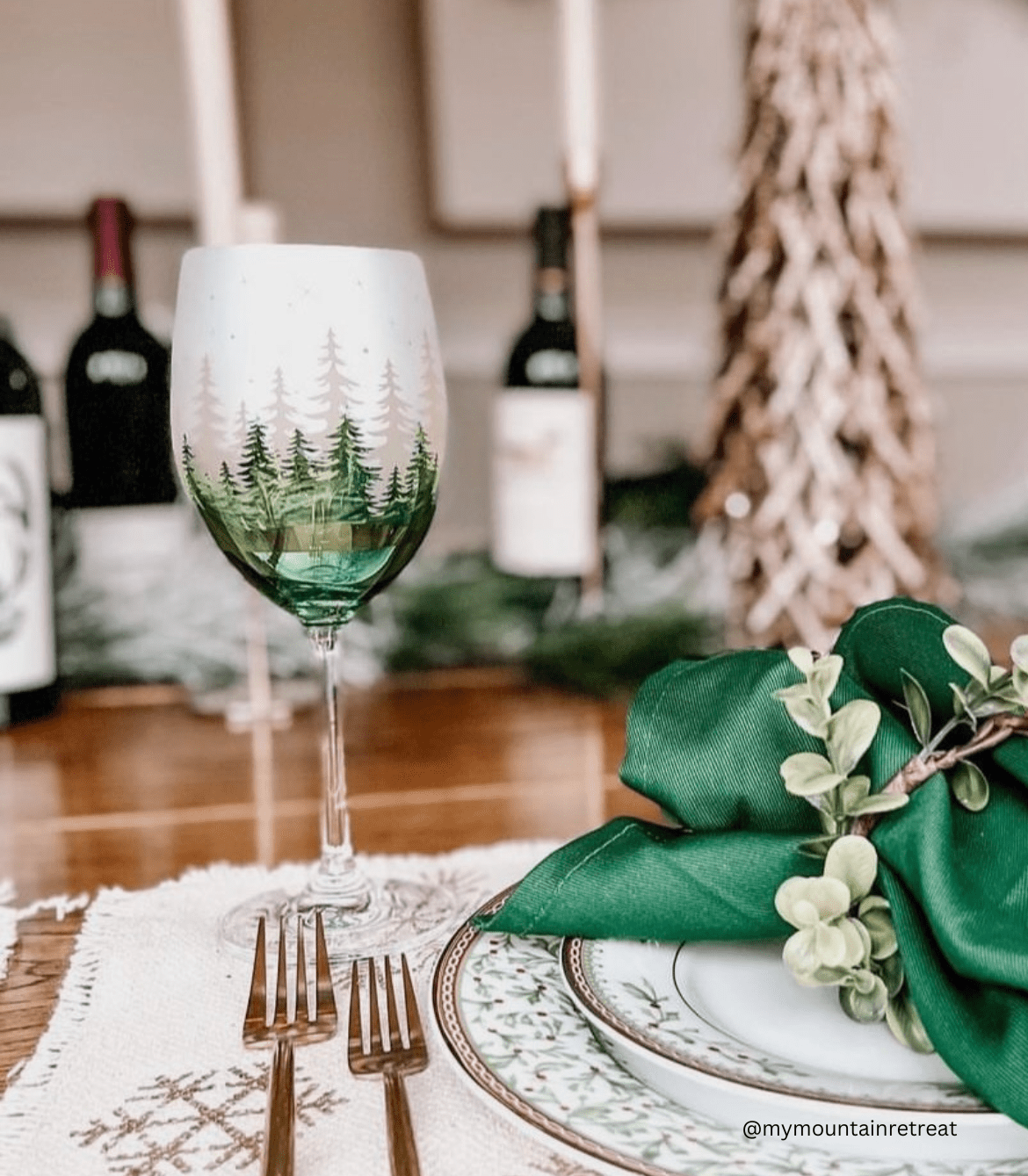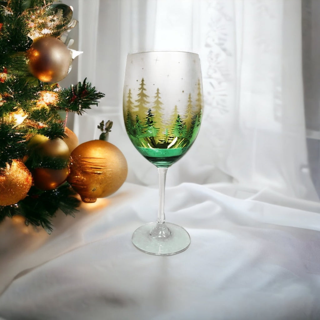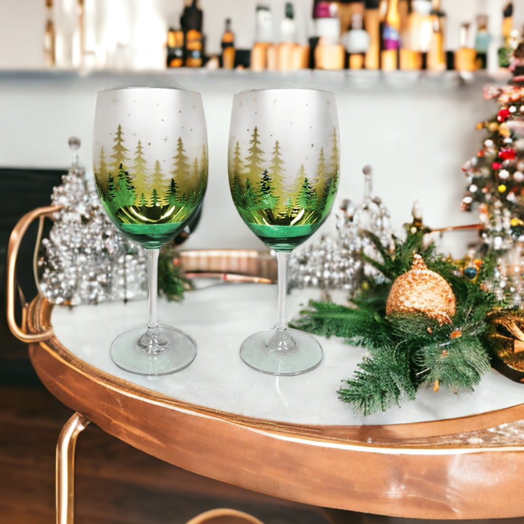 Engraved with a nostalgic wintery scene of pine trees, these Christmas wine glasses are designed with a shimmery silver & green finish, and a dazzling gold interior that will light up the room.