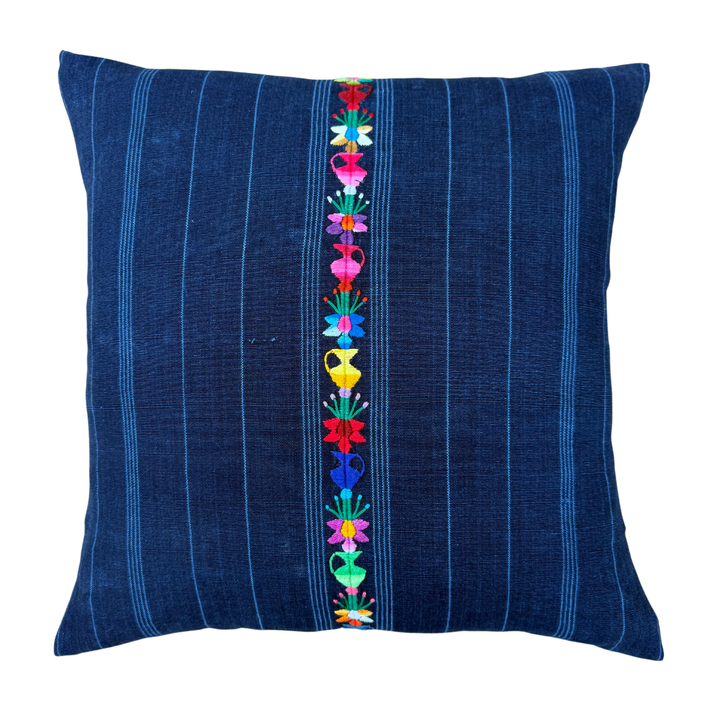 Add a touch of culture and sustainability to your home with Intertwined's handwoven vintage indigo pillow made from a traditional Mayan corte skirt. Embroidered accents and expert tailoring by Ruth & Naomi in Guatemala make this a unique and cheerful addition to your sofa or bed.