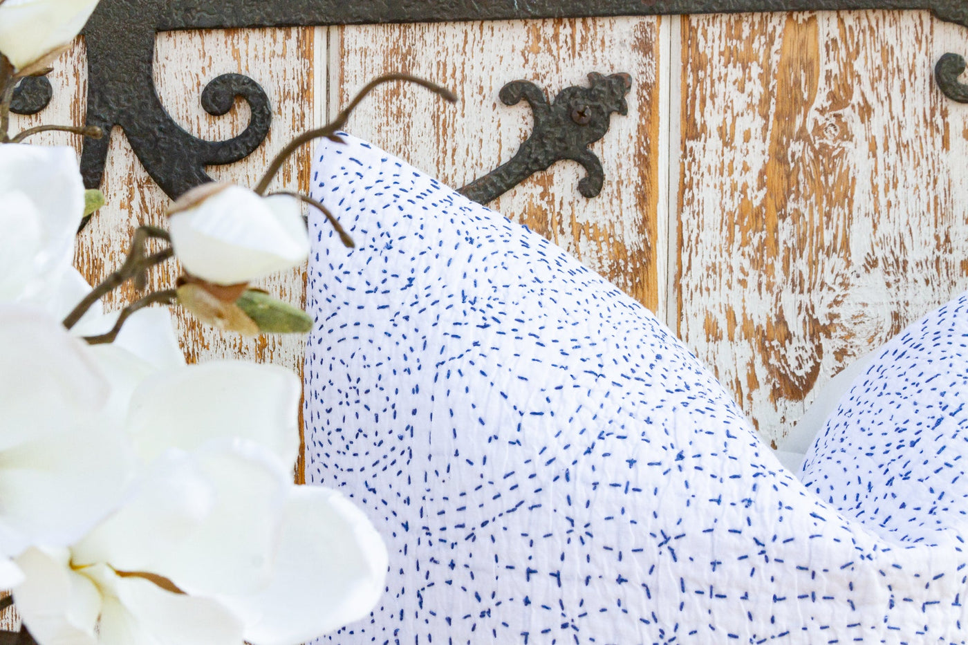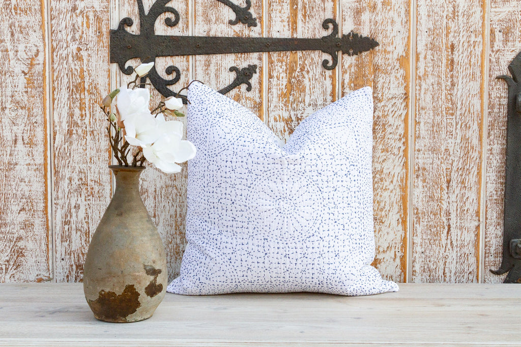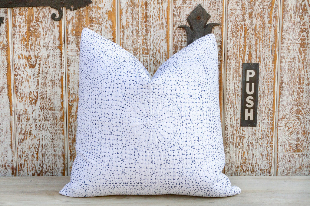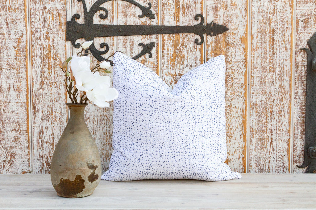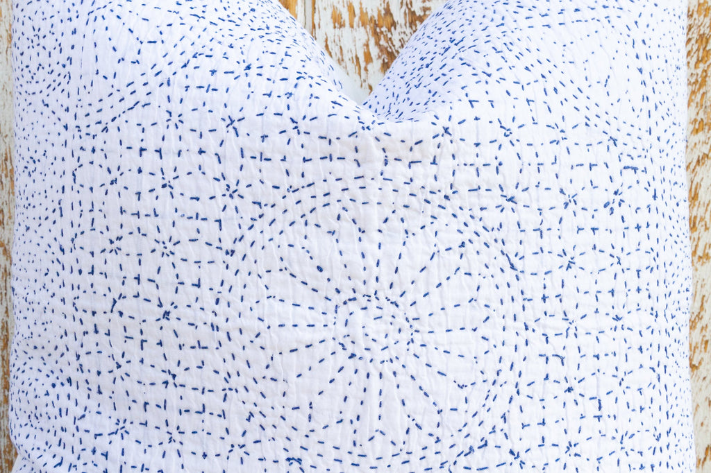 Celebrate the feminine with the handmade Filanan Gudari Pillow. This ornate pillow is cotton based and adorned with the Meghval tribe's thread work. The embroidered medallions in this incredibly soft piece of art represent the circle of life.