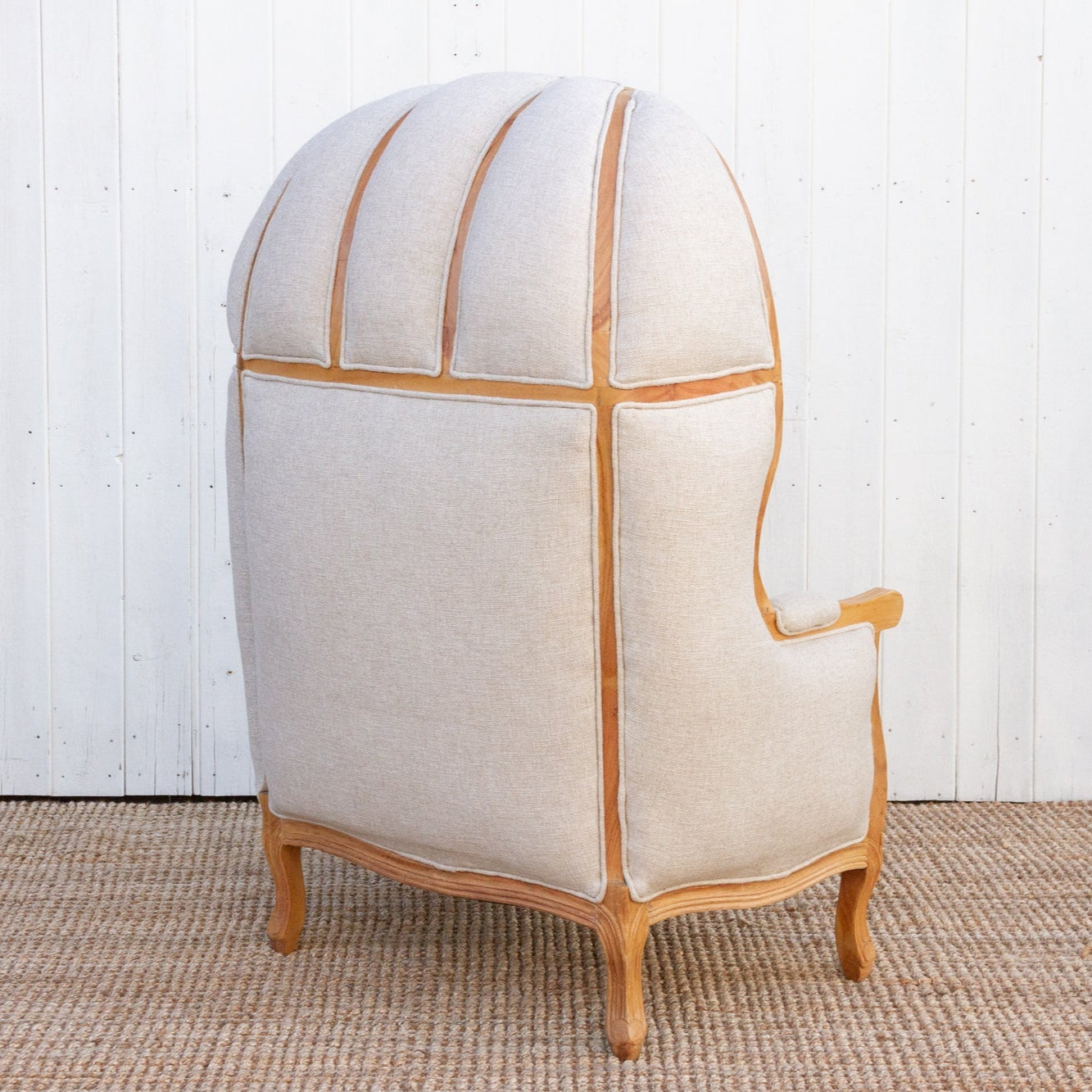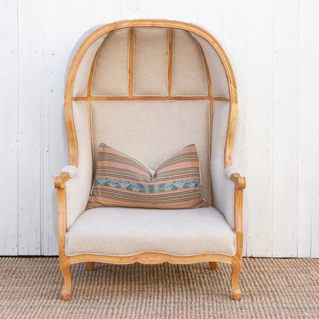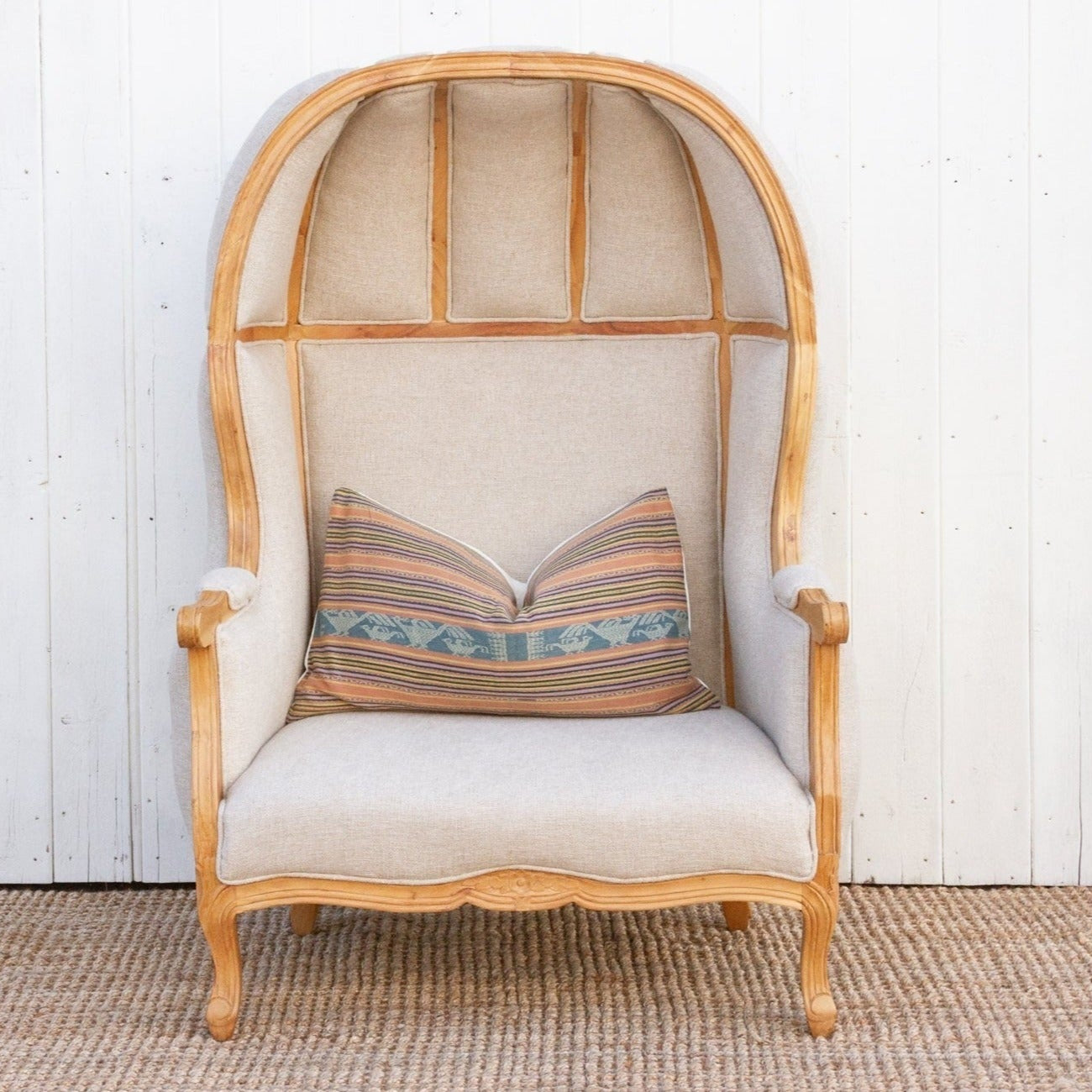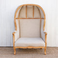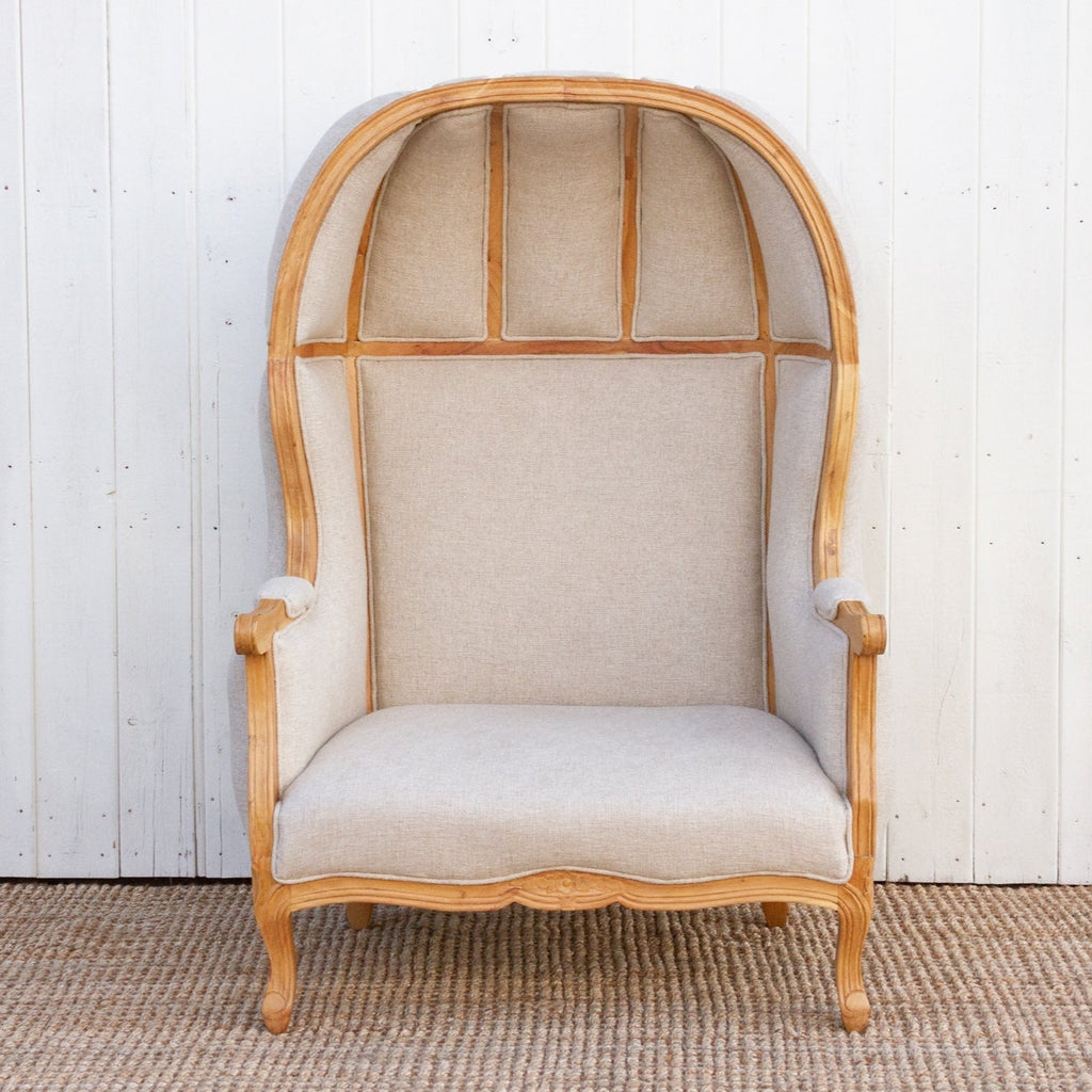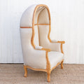 Stylish and comfortable, this oversize canopy arm chair is a statement piece for your home. This large upholstered accent chair has a rounded hooded canopy, cabriole legs, floral apron and shaped arms on a solid hardwood frame with bleached finish. This lounge chair has a handloom upholstery seat, interior and all around exterior.