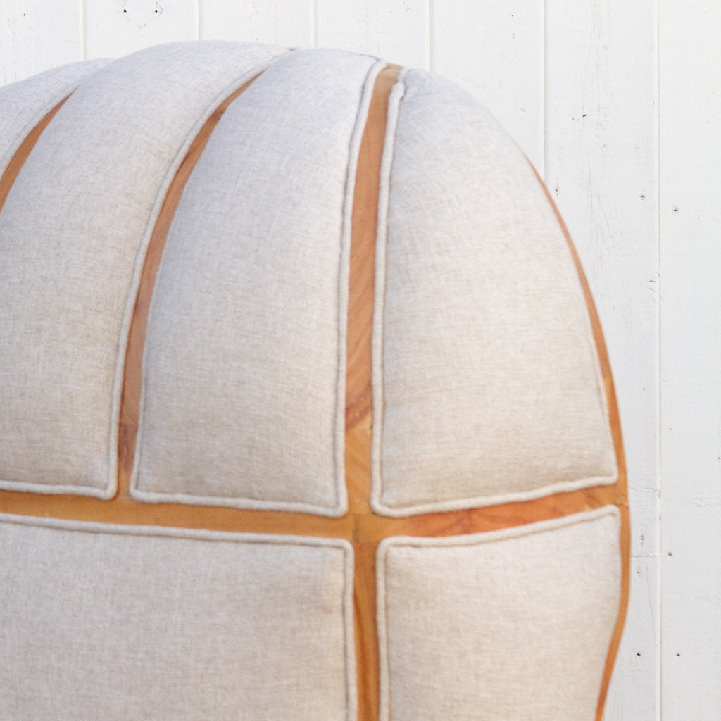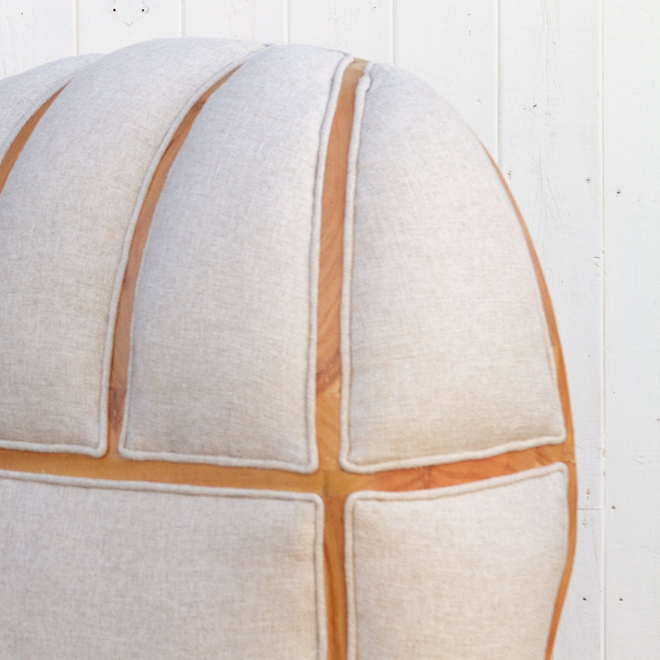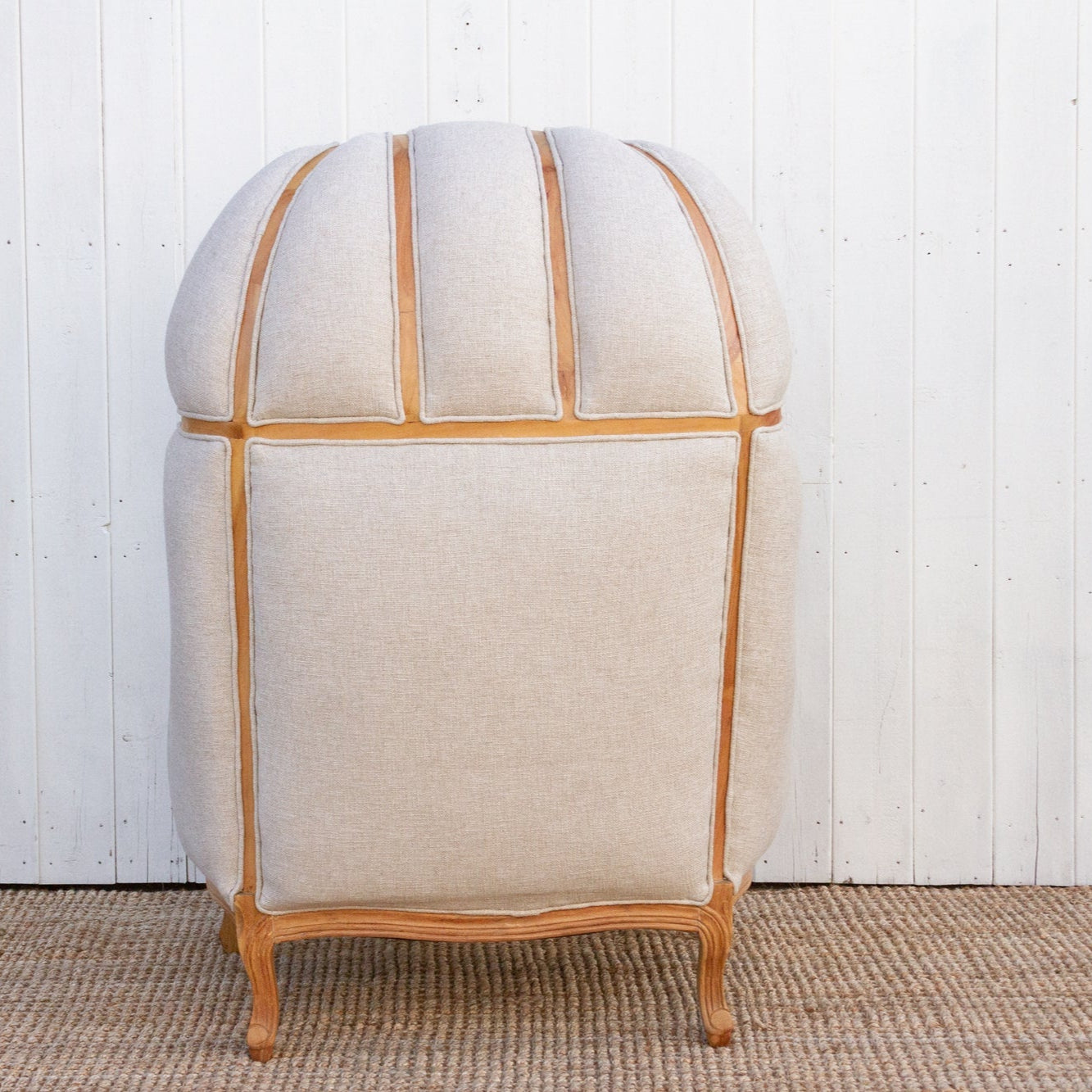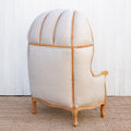 Stylish and comfortable, this oversize canopy arm chair is a statement piece for your home. This large upholstered accent chair has a rounded hooded canopy, cabriole legs, floral apron and shaped arms on a solid hardwood frame with bleached finish. This lounge chair has a handloom upholstery seat, interior and all around exterior.
