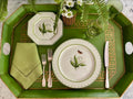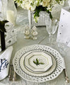The stunning "Lily of the Valley" collection, showcased on our green and white porcelain plates. Each plate features a beautifully detailed original painting by Carolyne Roehm, depicting an elegant lily of the valley. These plates are designed to add a touch of charm and sophistication to any table setting.