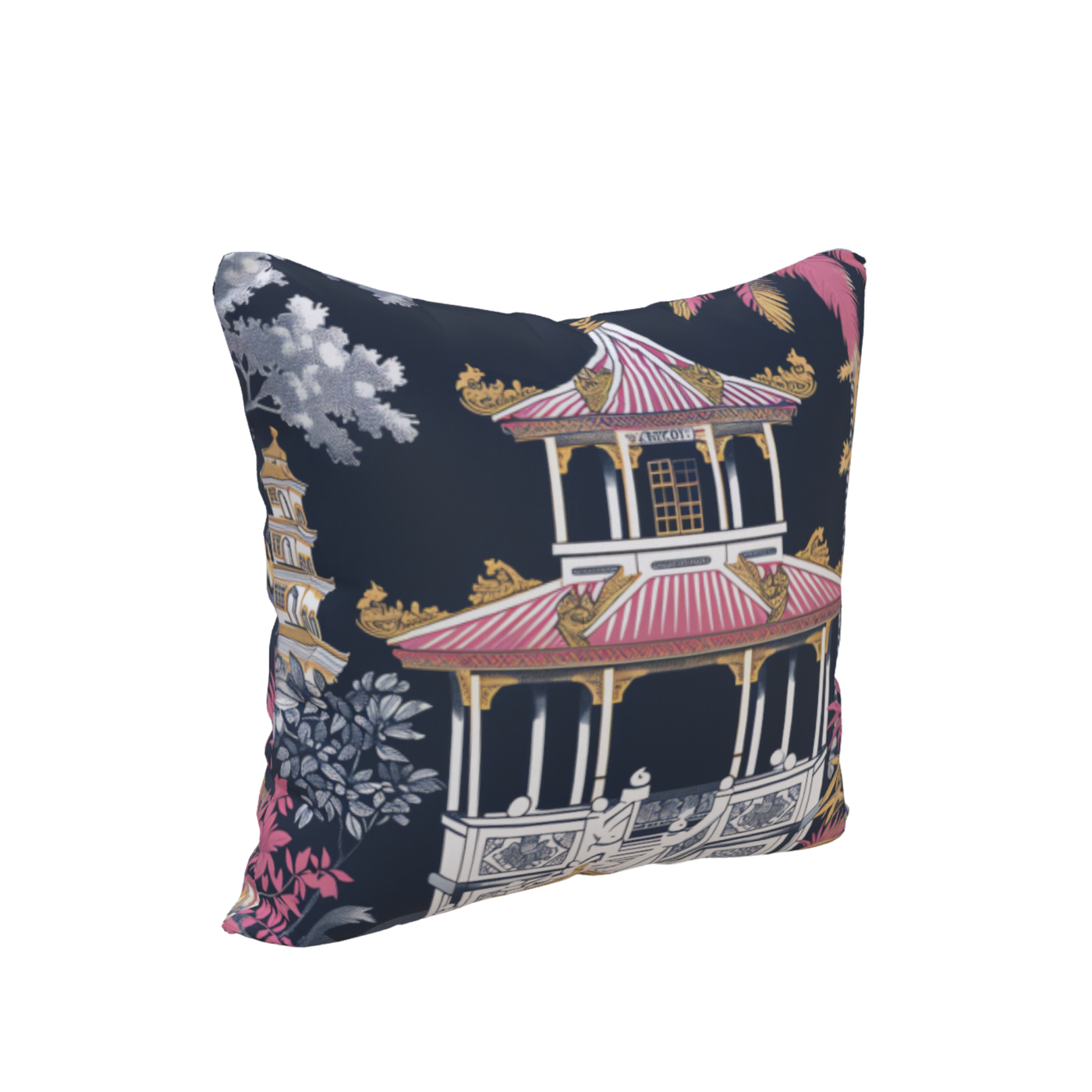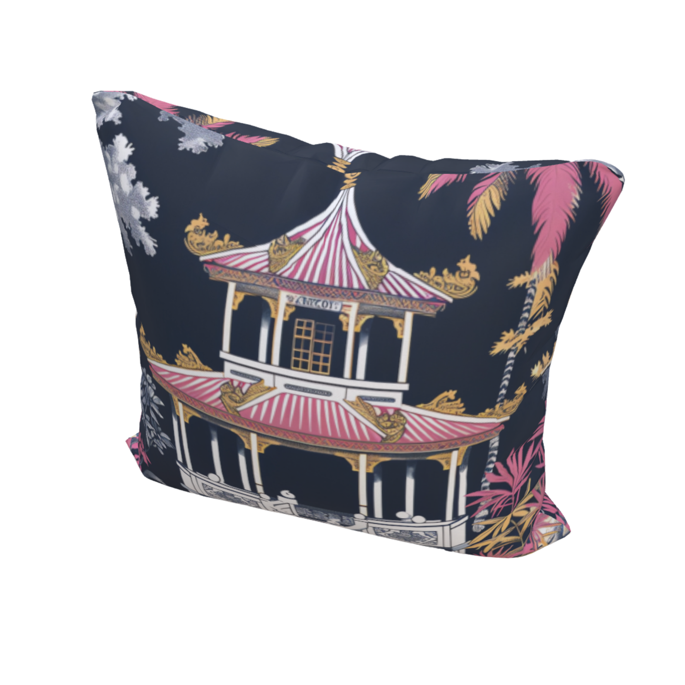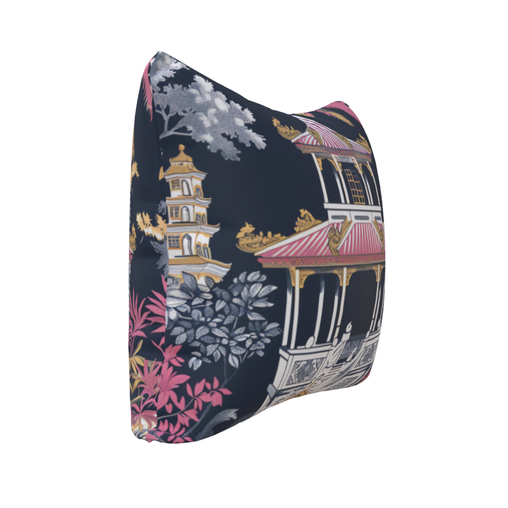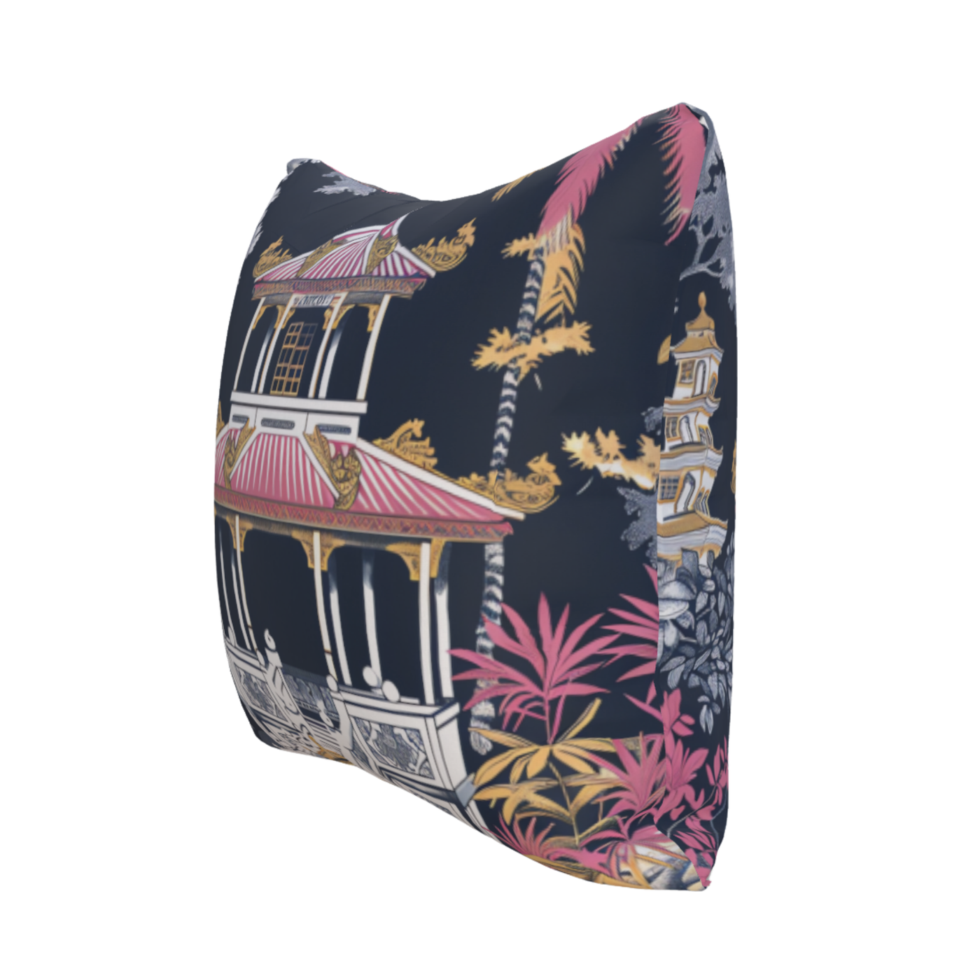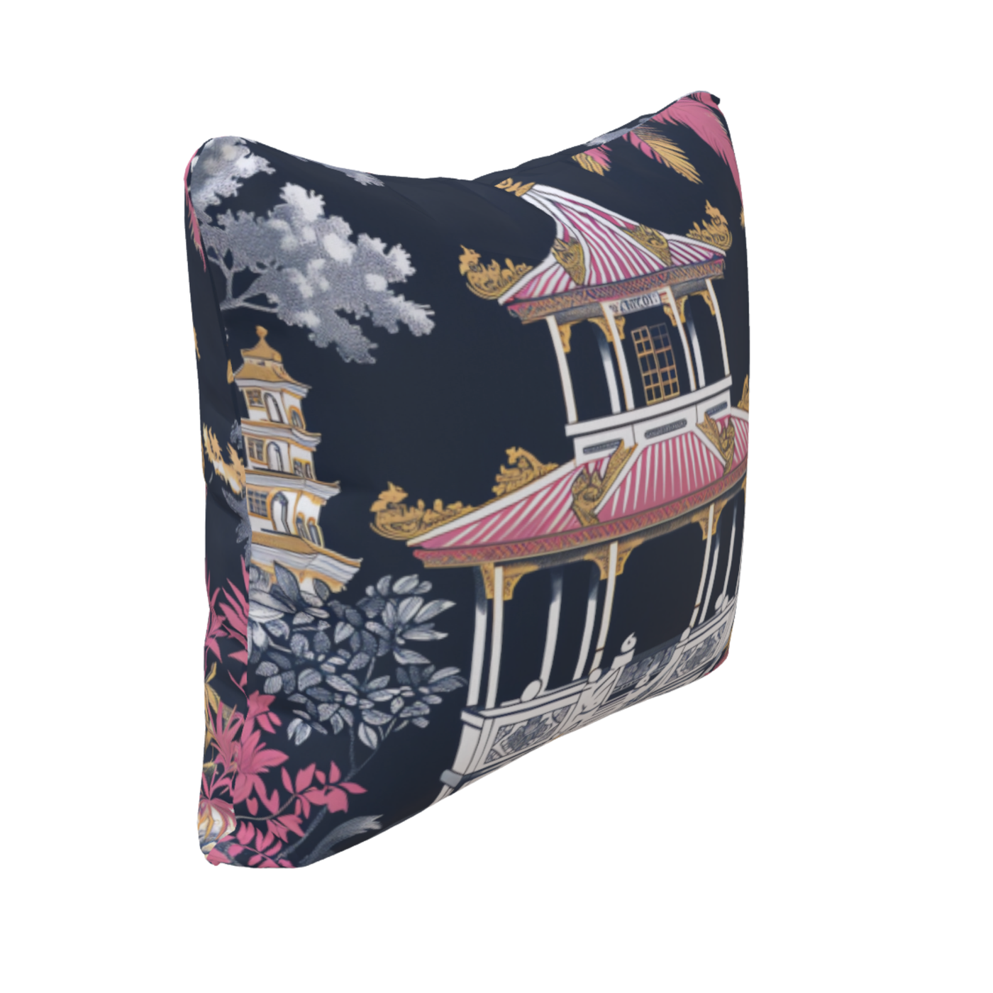 Romantic chinoiserie reimagined—pink pagodas in a painter’s hand.
