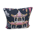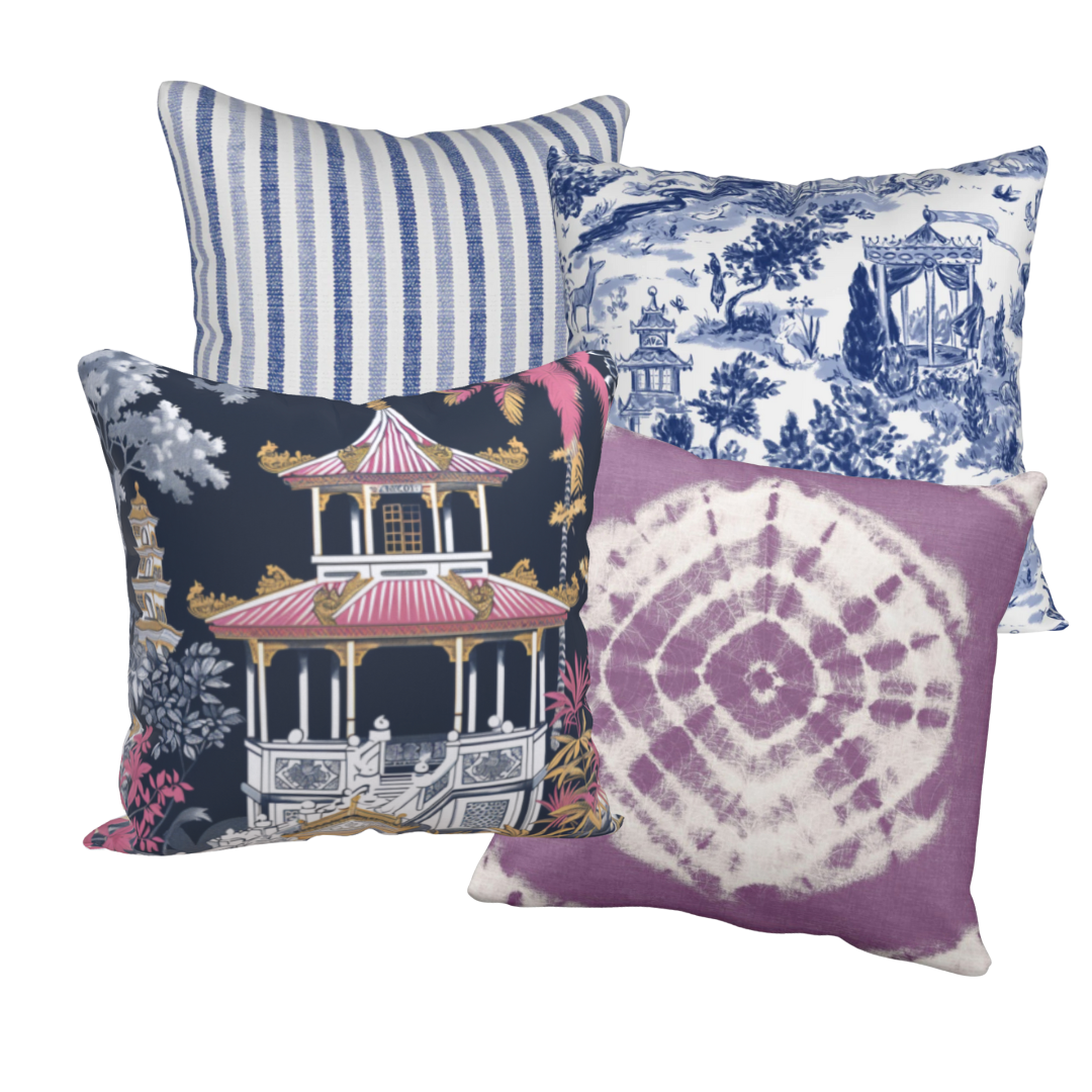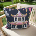 Lotus Court reinvents traditional toile with a modern, sketched sensibility. A delicate white and pink pagoda rests on a deep indigo field, offering romance, architectural stillness, and painterly richness. It's tranquil yet statement-making.