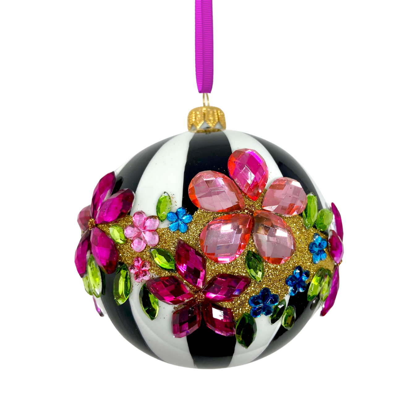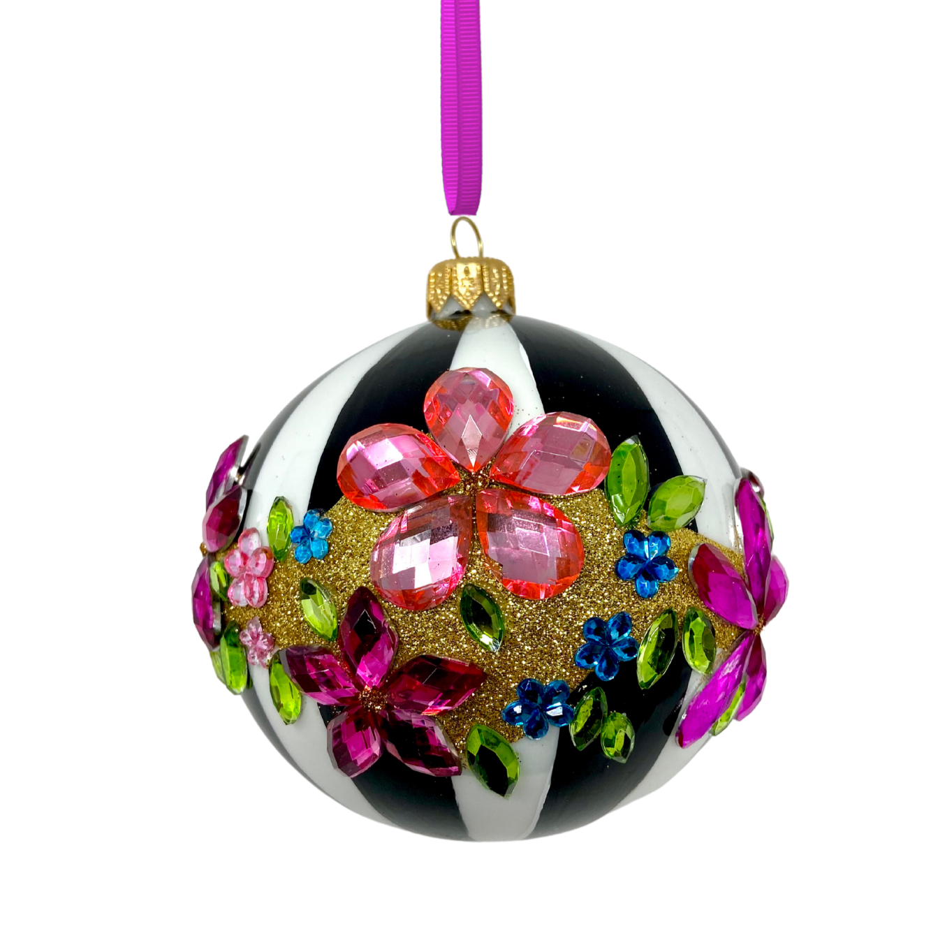 Draped in monochrome stripes and dripping with gem-bright blossoms, this bauble doesn’t whisper festive—it roars it. Think garden party meets runway show, with florals that sparkle like they’ve got somewhere fabulous to be.