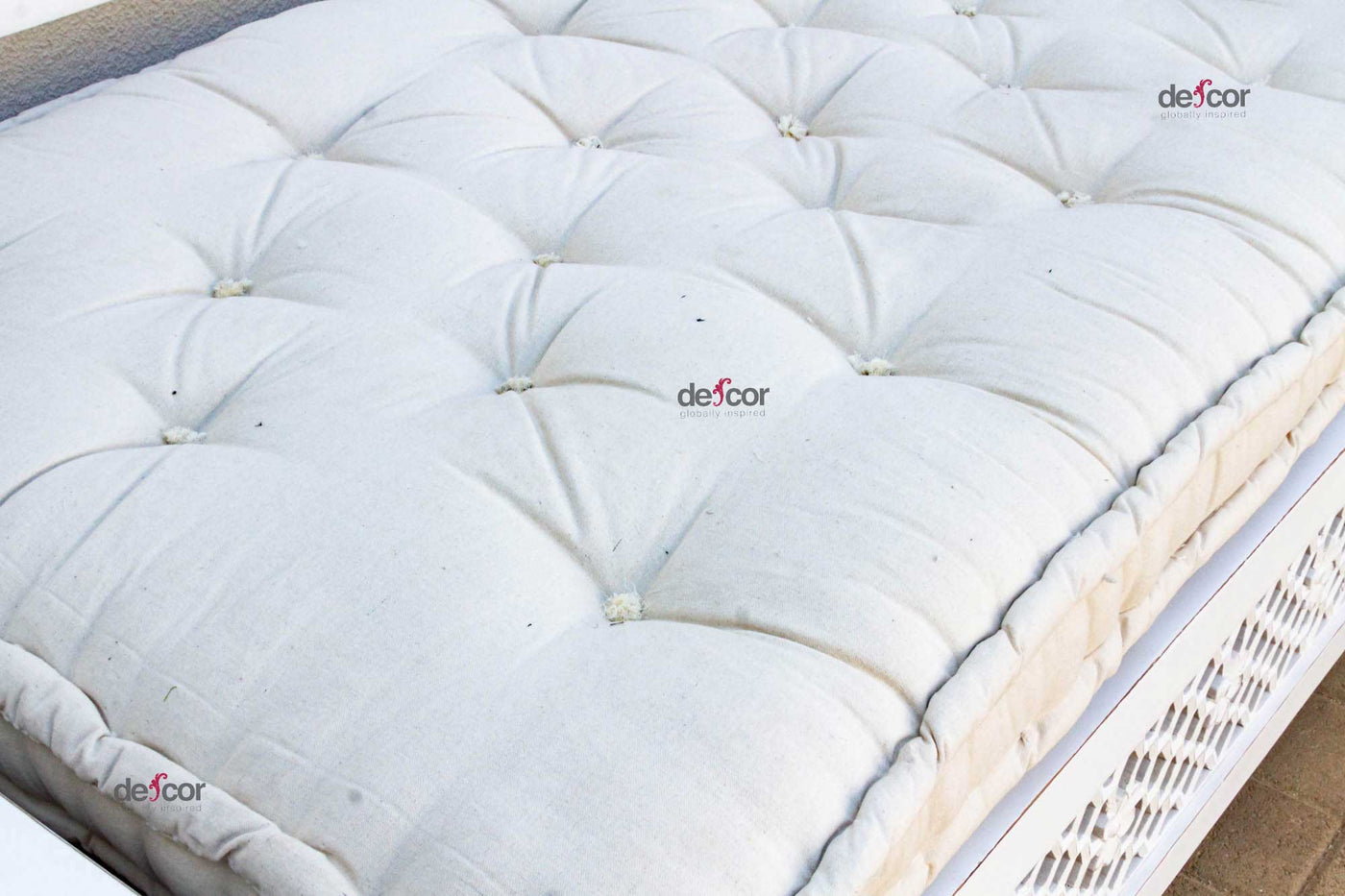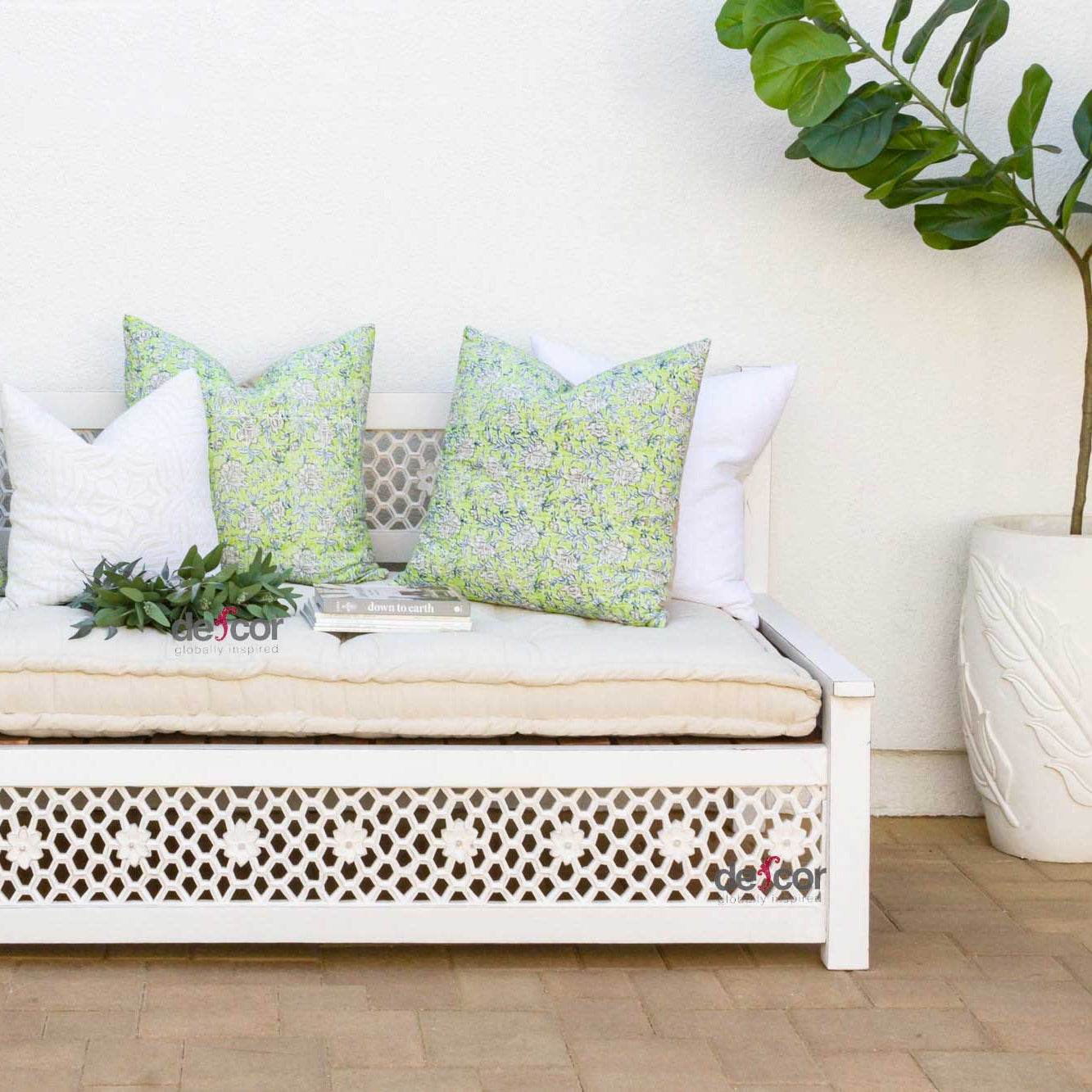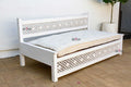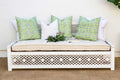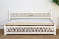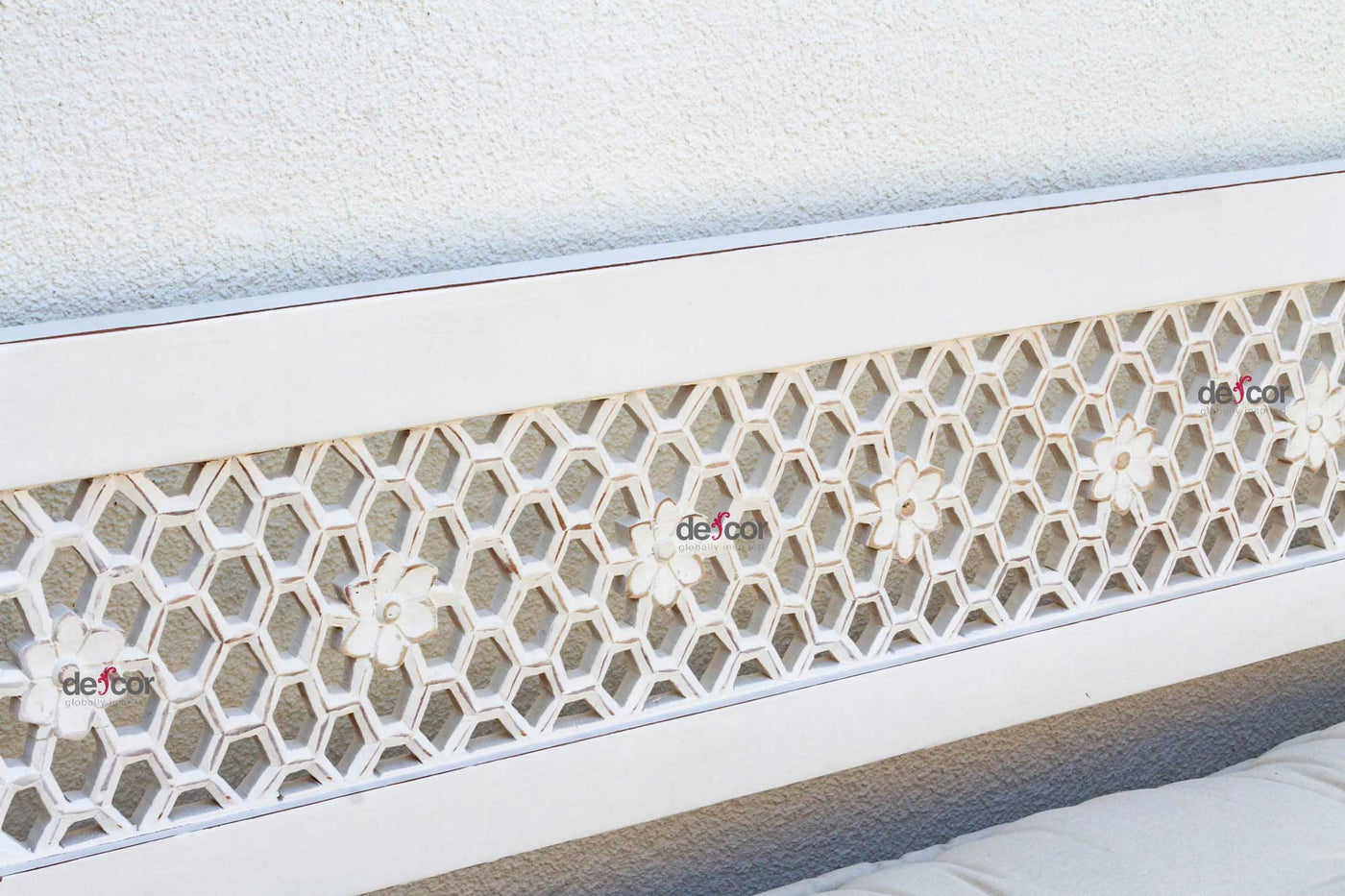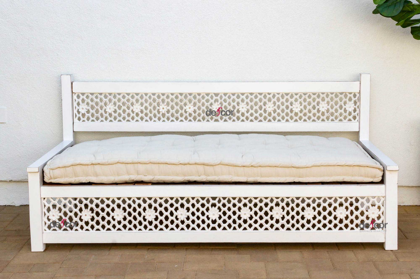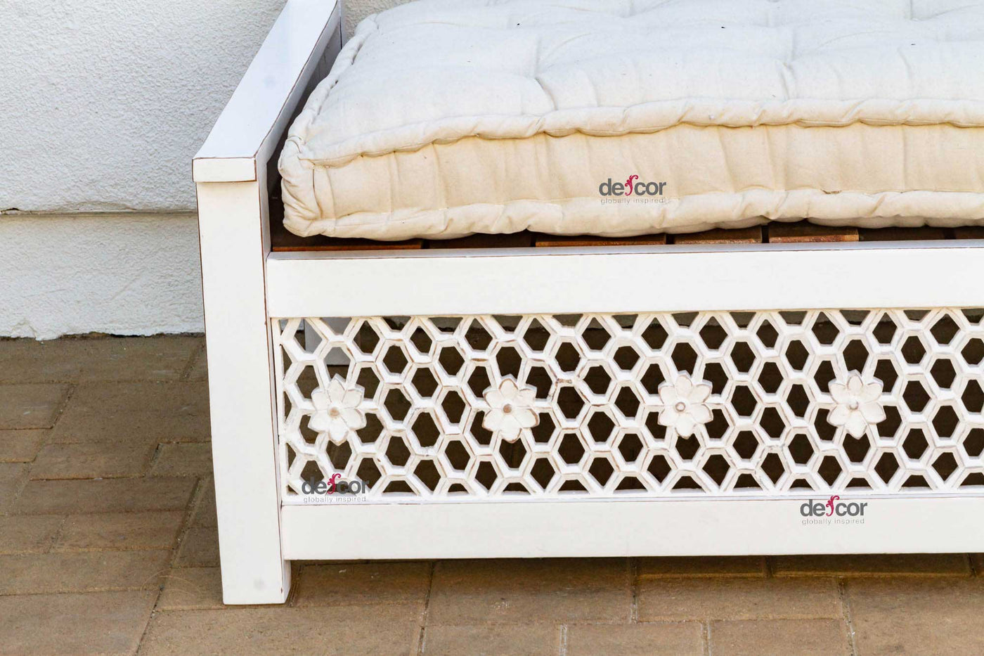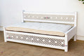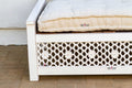 Inspired by ancient Moorish architecture, our custom Jali sofa daybed features a finely carved see-through floral panel combined with clean modern lines. This Moorish inspired daybed sofa has a custom tufted mattress with cotton canvas cover. A fun bohemian yet classic sofa made from reclaimed teak wood with a distressed white painted finish.