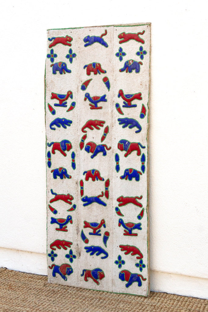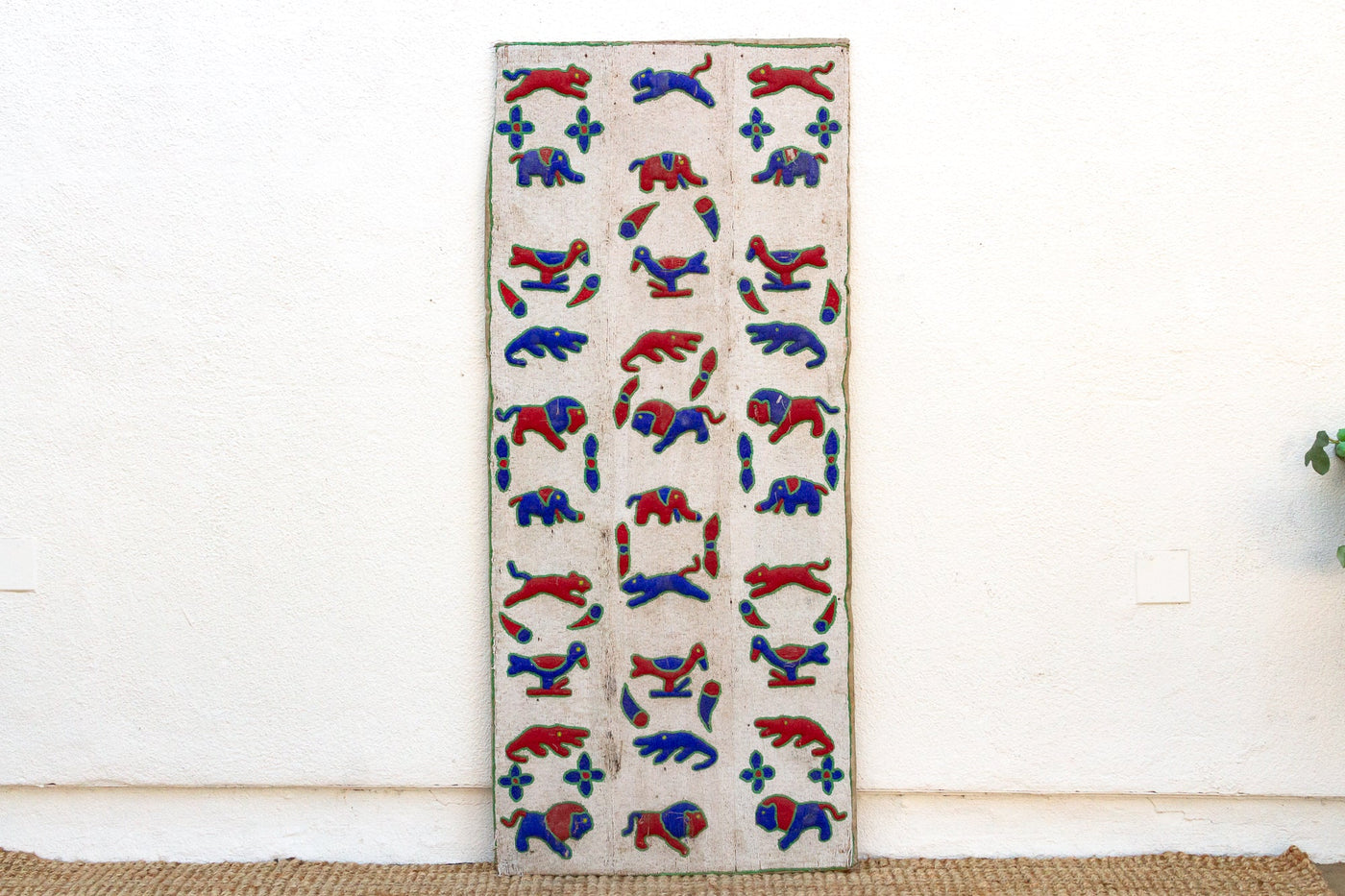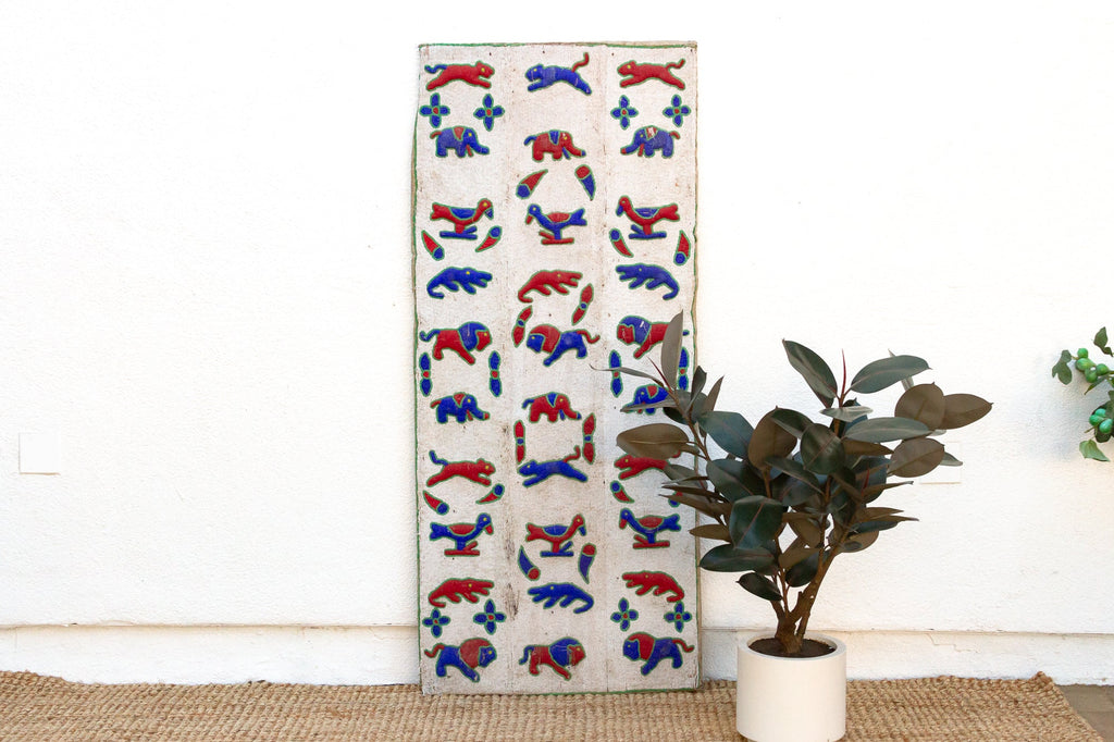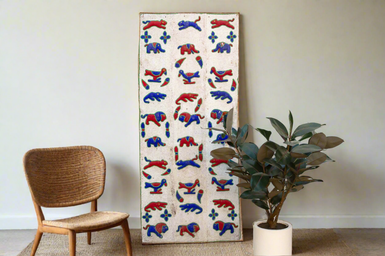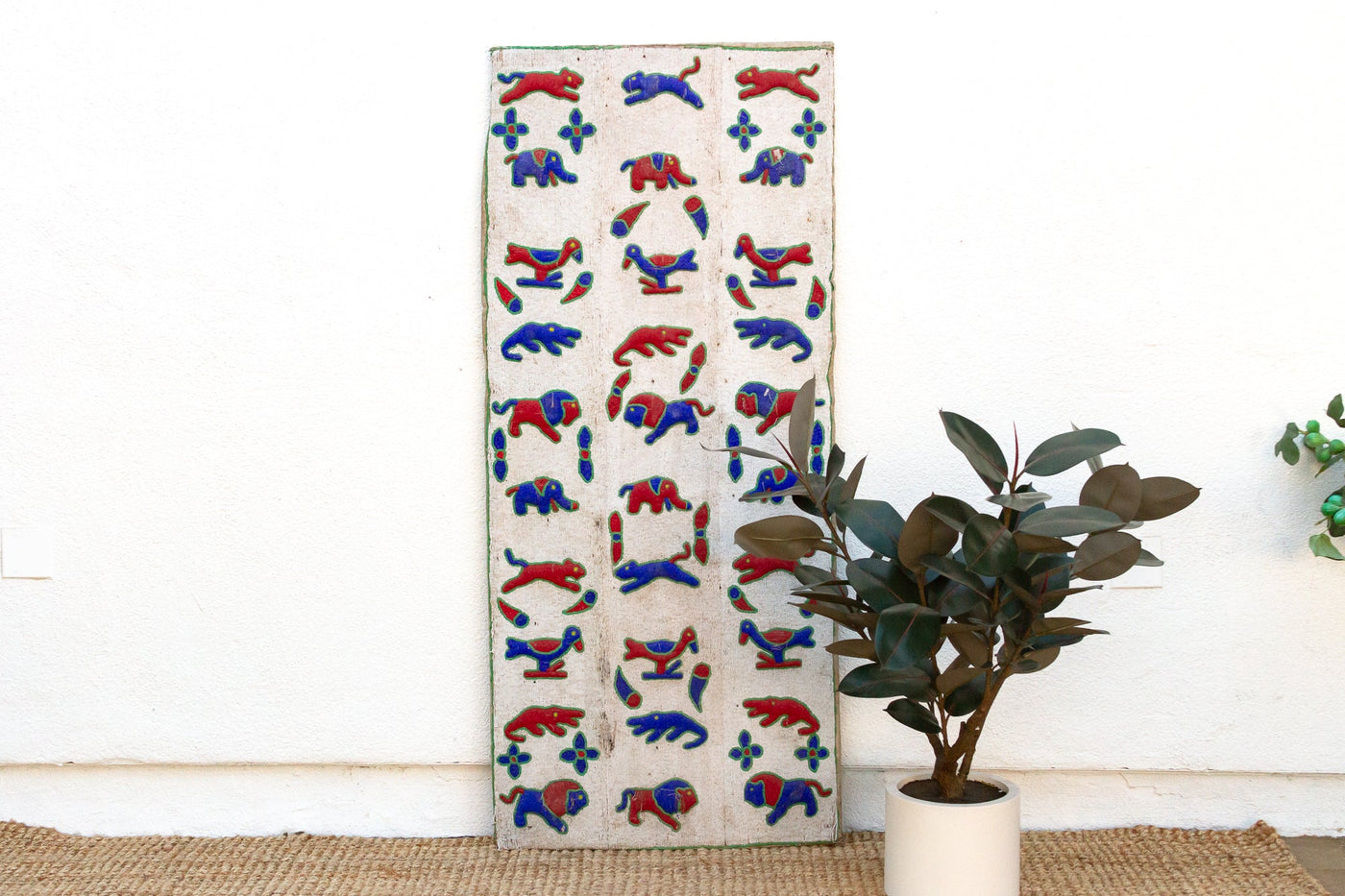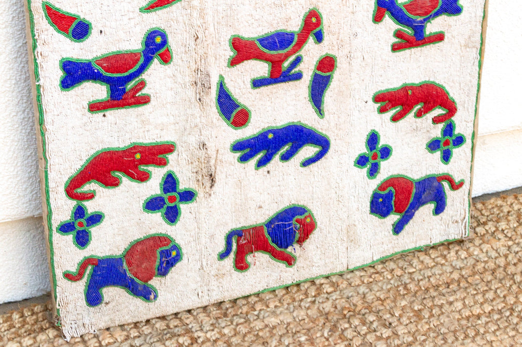 Embark on a Visual Safari with this Beaded Wall Panel: This impressive vintage beaded wall panel, standing tall at 70 inches, invites you on a visual safari through the African savanna. A vibrant menagerie of animals — lions, elephants, crocodiles, birds — is meticulously rendered in colorful beads against a dramatic black backdrop. This captivating tapestry, handcrafted with intricate detail, celebrates the rich biodiversity and cultural heritage of Africa. Imagine it as a striking focal point in your living room, a conversation starter in your dining room, or a unique addition to your bedroom décor. This beaded masterpiece is sure to infuse your space with a touch of global charm and artistic wonder.