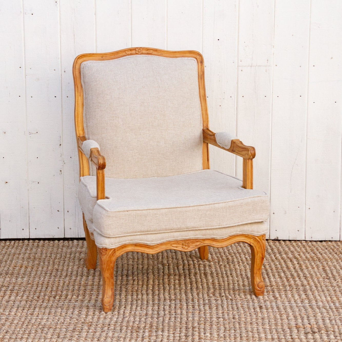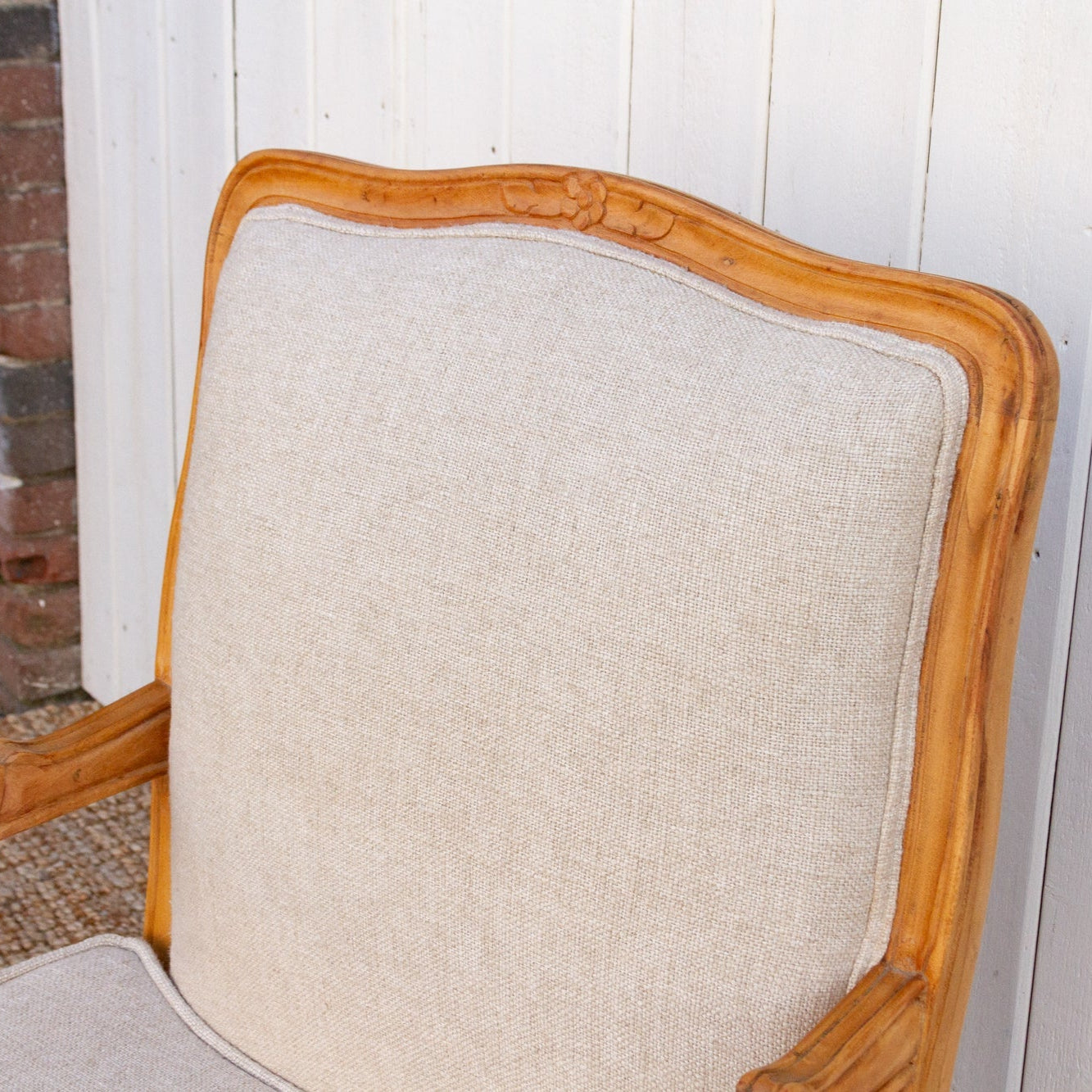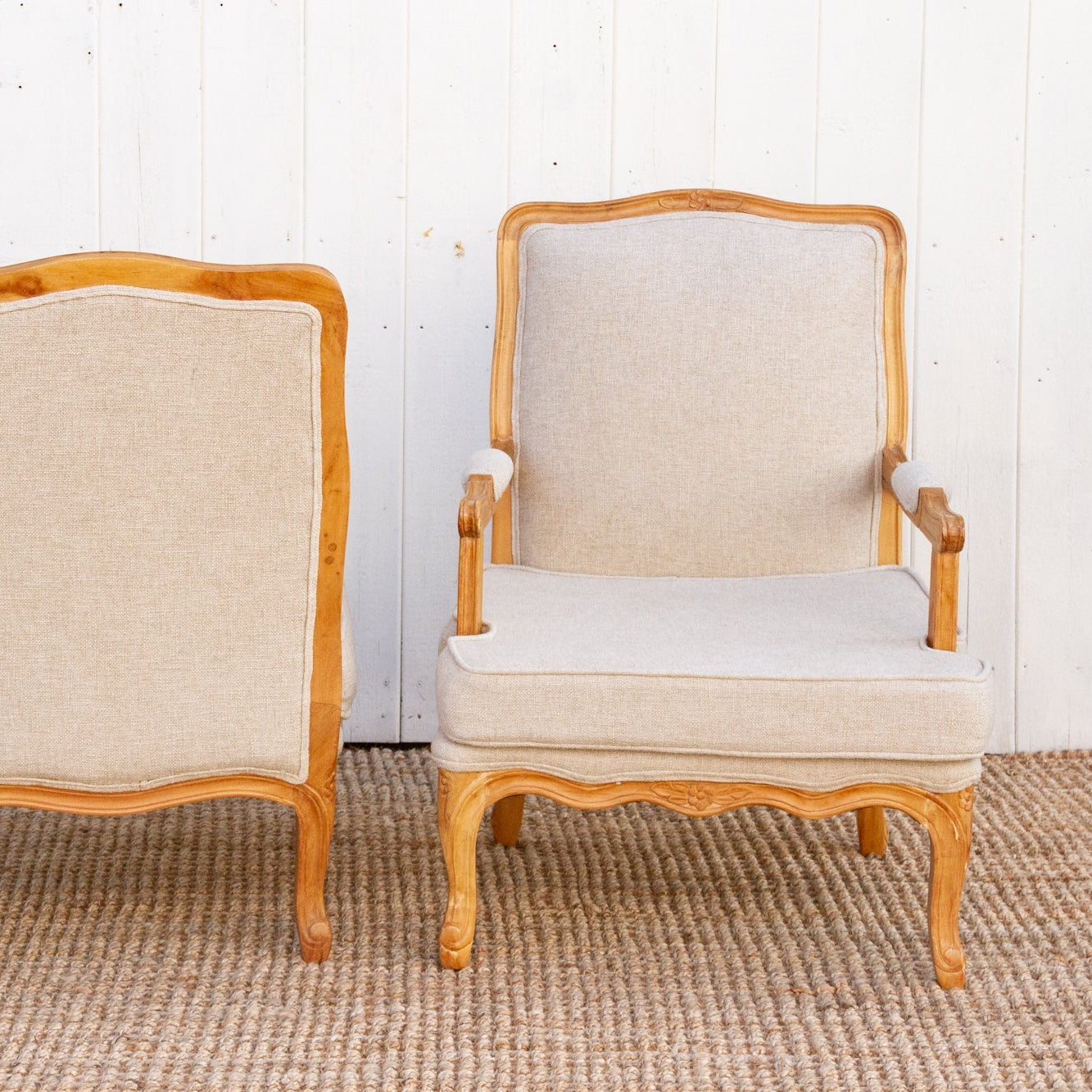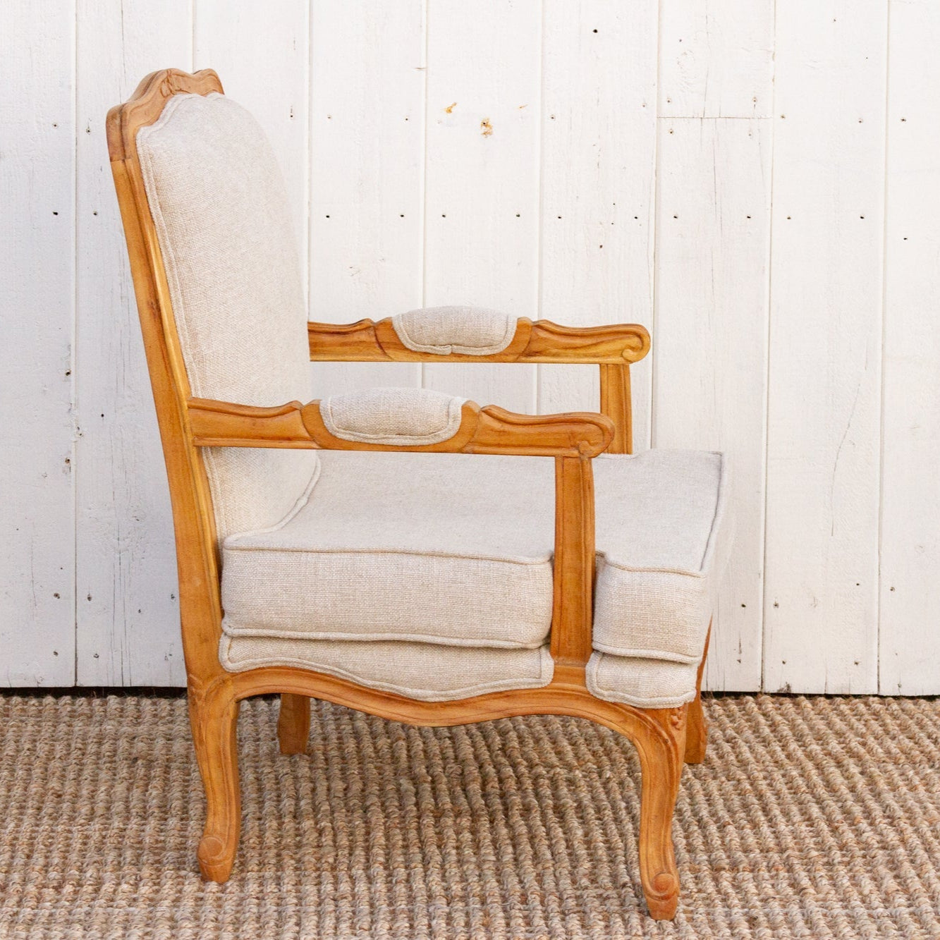 Reimagine your space with our upholstered club chairs, a stunning homage to the iconic French Louis XV bergère armchair. This masterpiece boasts an intricately carved, bleached hardwood frame, faithfully echoing the antique grandeur that inspired it. Flowing lines and delicate floral motifs dance across the frame, while the plush handloom cotton upholstery in an earthy oatmeal hue invites you to sink into luxurious comfort.