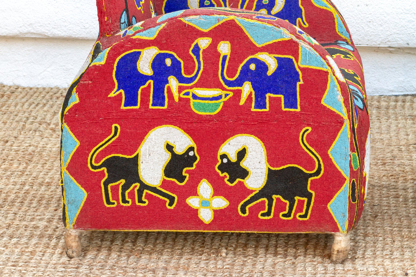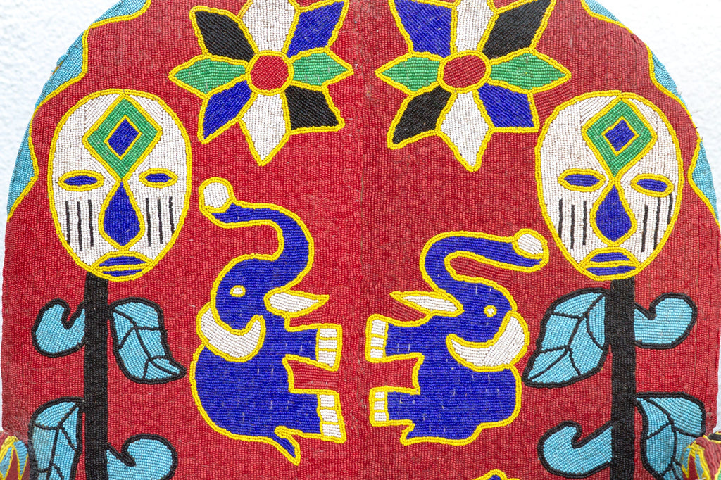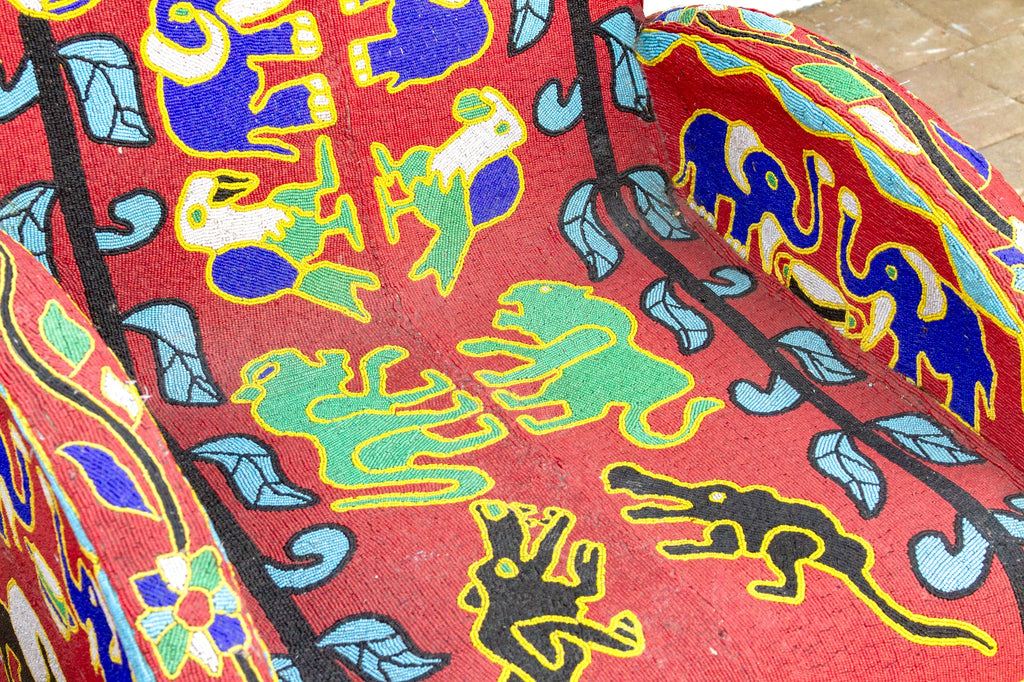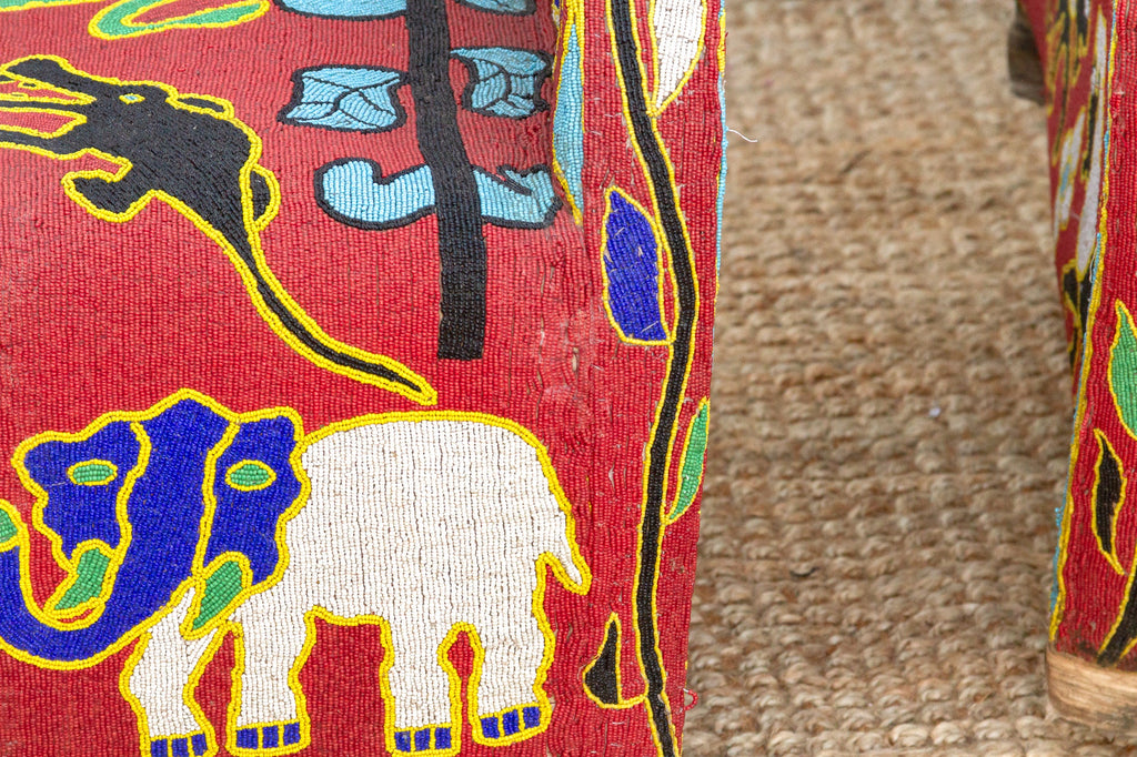 Journey back to the royal courts of the Yoruba people with this captivating pair of beaded chairs, originally used to signify the power and prestige of kings and queens. Thousands of tiny glass beads meticulously woven onto a vibrant red fabric create a mesmerizing tapestry of intricate patterns and symbolic motifs, including stylized faces, elephants, and birds, reflecting the deep connection between humans and the natural world. With their comfortable rounded backs and sturdy construction, these chairs offer both relaxation and visual intrigue, making them ideal statement pieces in a modern home. Whether your style leans towards eclectic, boho, or even a maximalist aesthetic, these chairs will effortlessly add a touch of cultural richness and vibrant energy to your space.