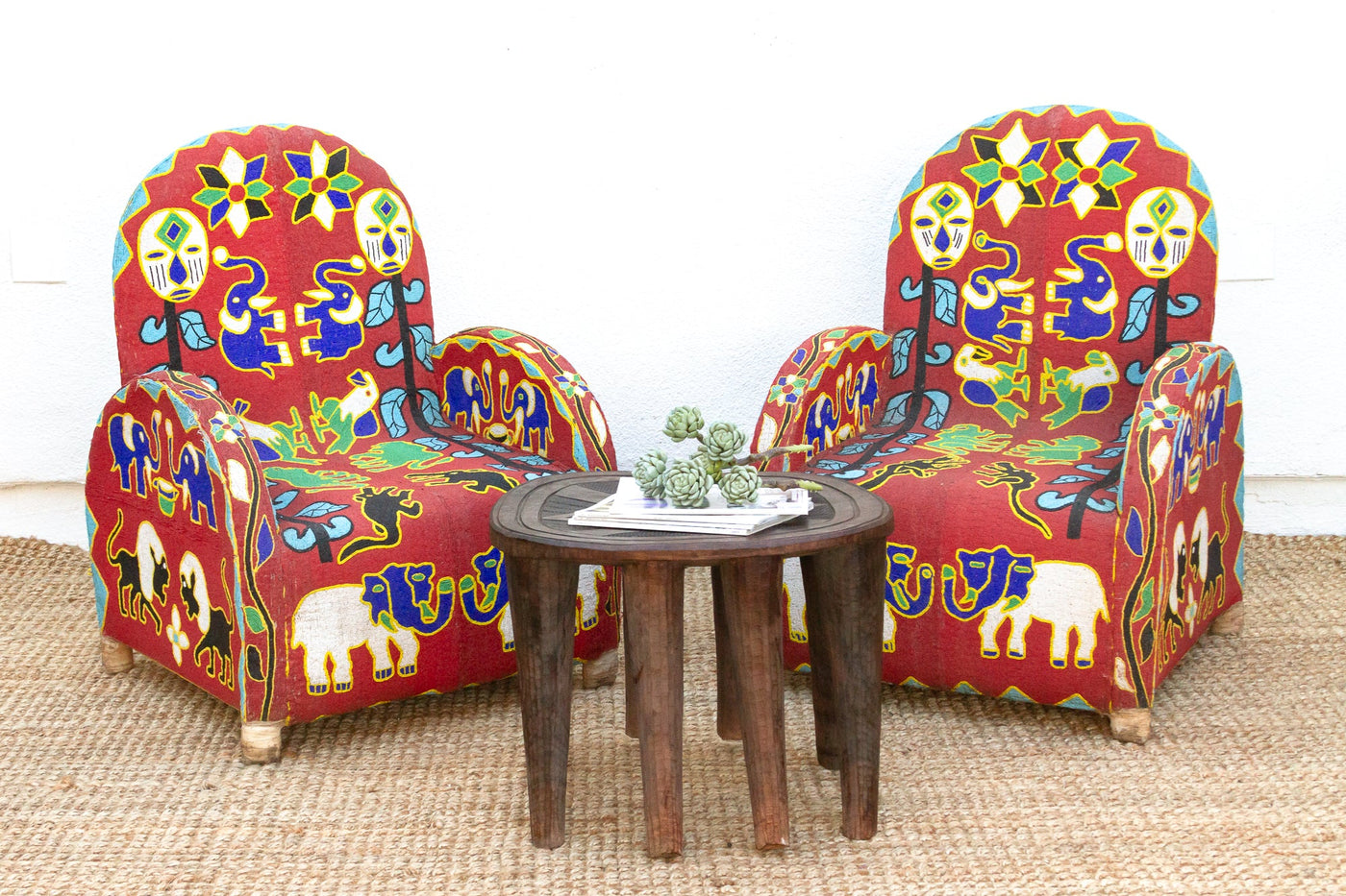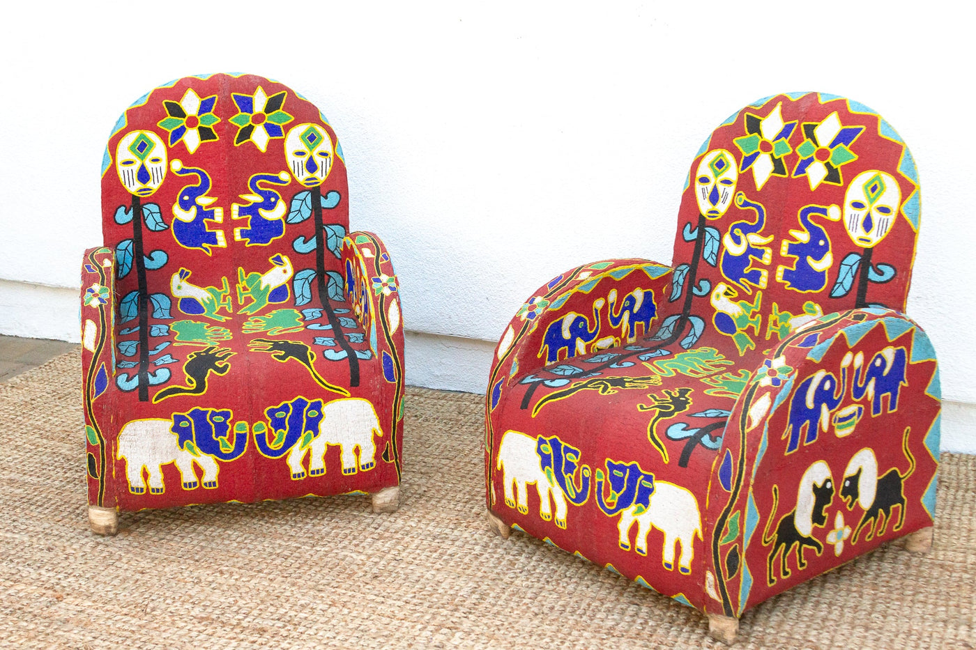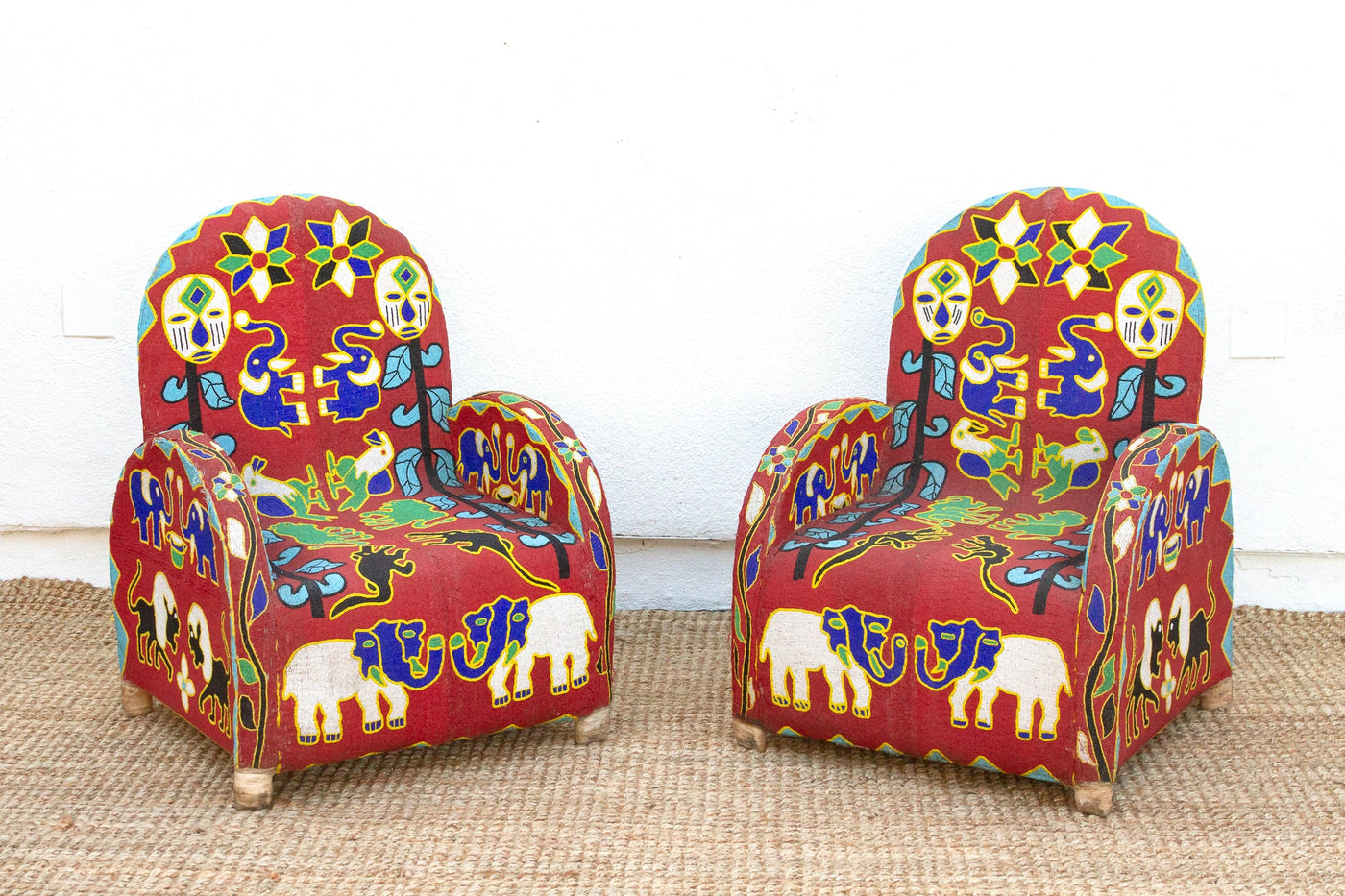 Journey back to the royal courts of the Yoruba people with this captivating pair of beaded chairs, originally used to signify the power and prestige of kings and queens. Thousands of tiny glass beads meticulously woven onto a vibrant red fabric create a mesmerizing tapestry of intricate patterns and symbolic motifs, including stylized faces, elephants, and birds, reflecting the deep connection between humans and the natural world. With their comfortable rounded backs and sturdy construction, these chairs offer both relaxation and visual intrigue, making them ideal statement pieces in a modern home. Whether your style leans towards eclectic, boho, or even a maximalist aesthetic, these chairs will effortlessly add a touch of cultural richness and vibrant energy to your space.