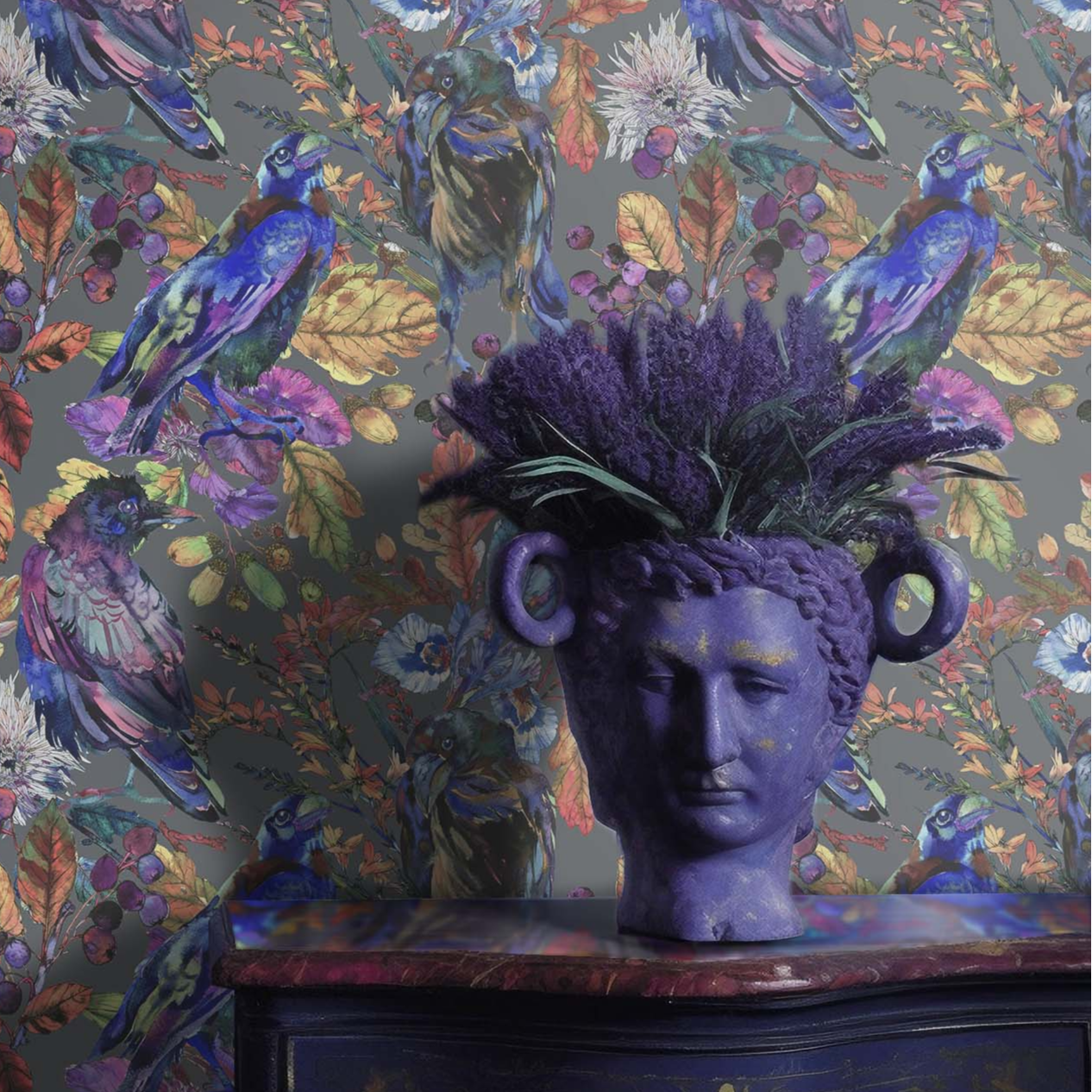 Ravenswood Mystery is inspired by English country houses where walls are often covered in chinoiserie or tapestry. Our take is more whimsical and playful. Large watercolor ravens and foliage create a lush repeat that lends itself to multiple decor styles. Color Palette: Slate, orange, navy, gold, purple.