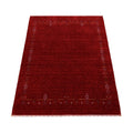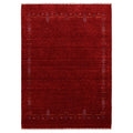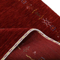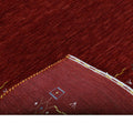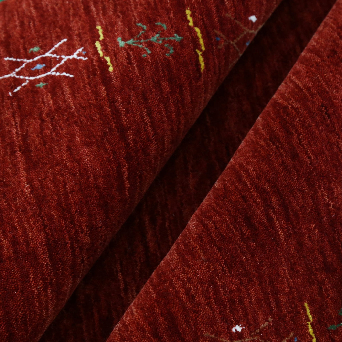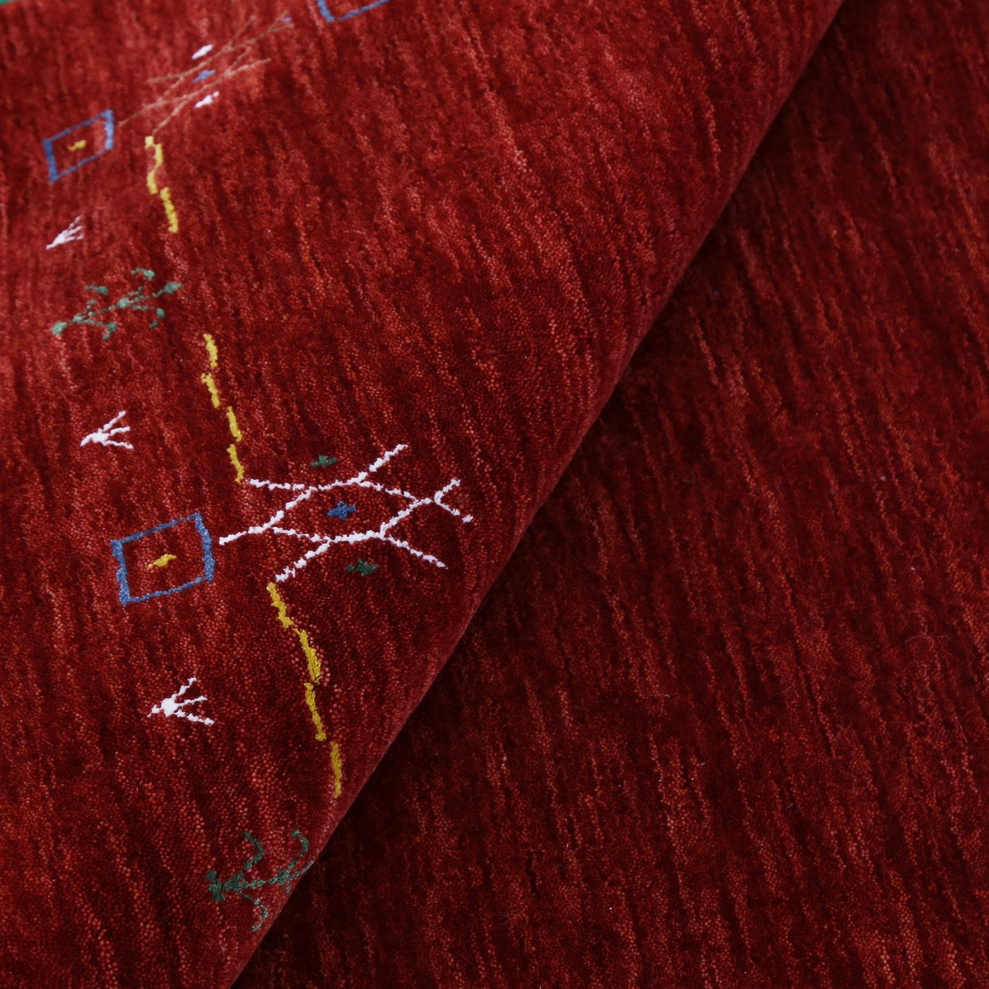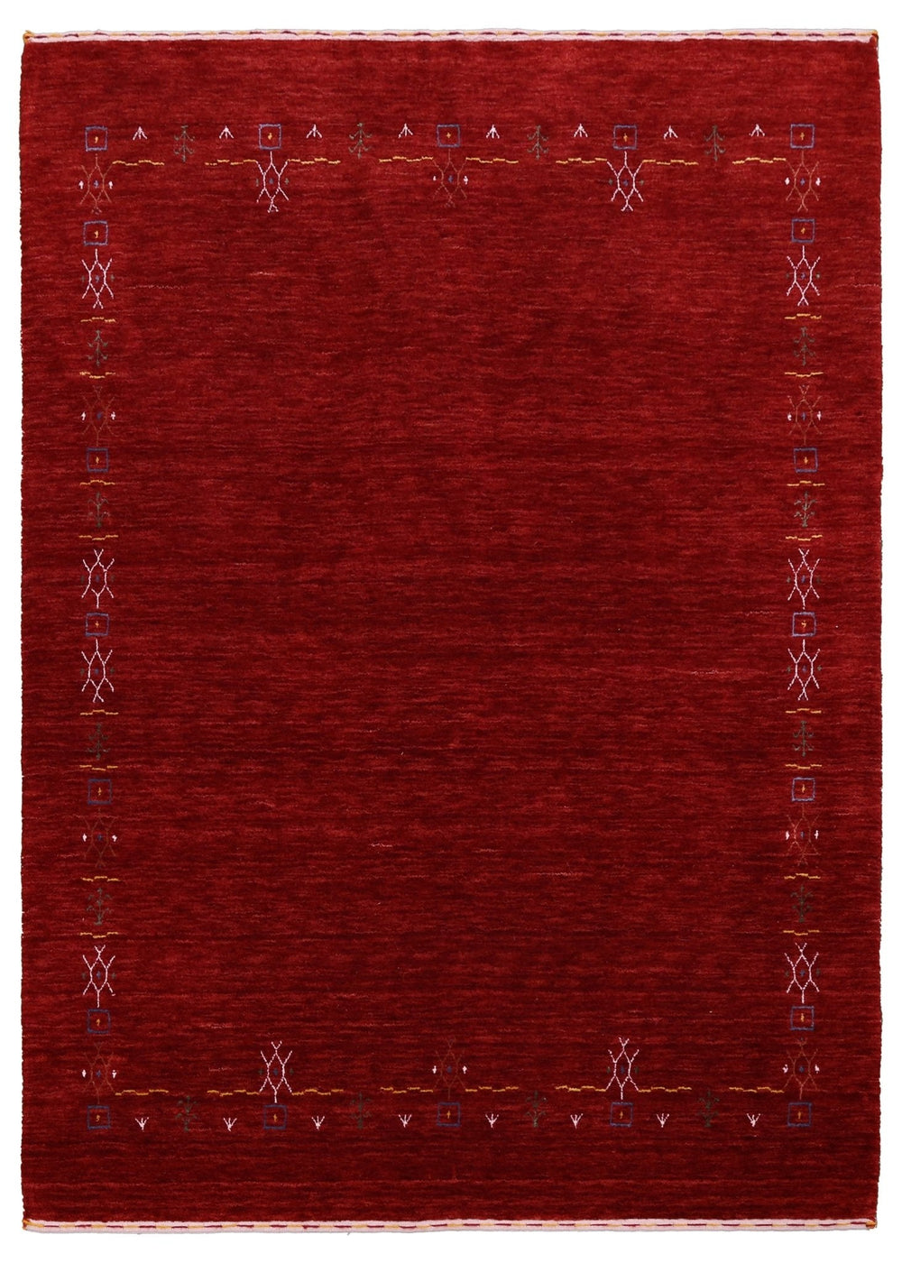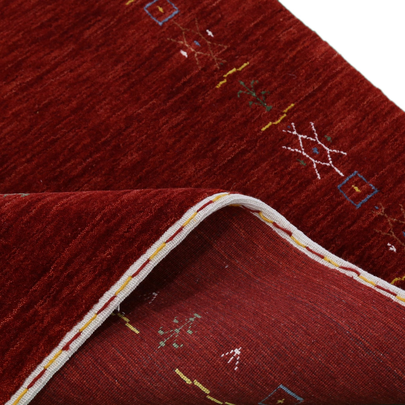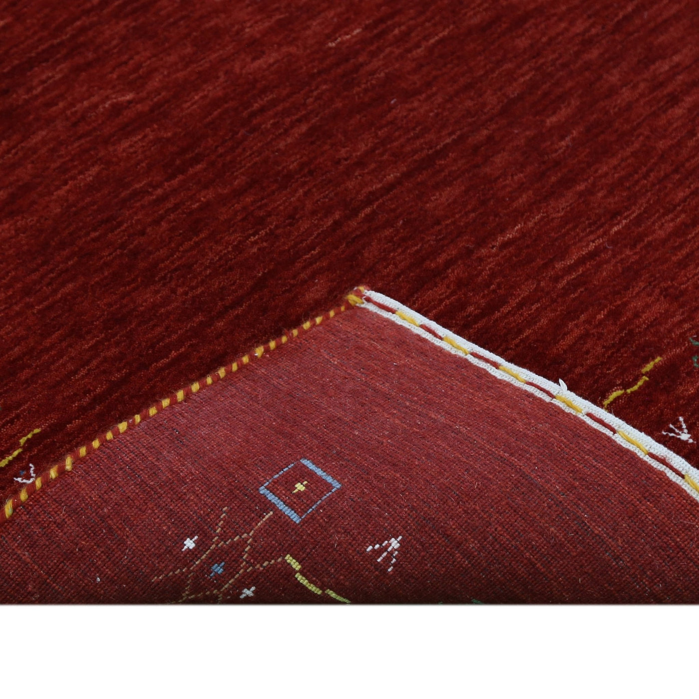 This hand loomed wool rug features a striking red Gabbeh border design, adding a touch of warmth and elegance to any room. Crafted with care and ready to ship, its quality construction ensures durability and its beautiful design offers a timeless look. Elevate your space with this versatile and unique area rug.