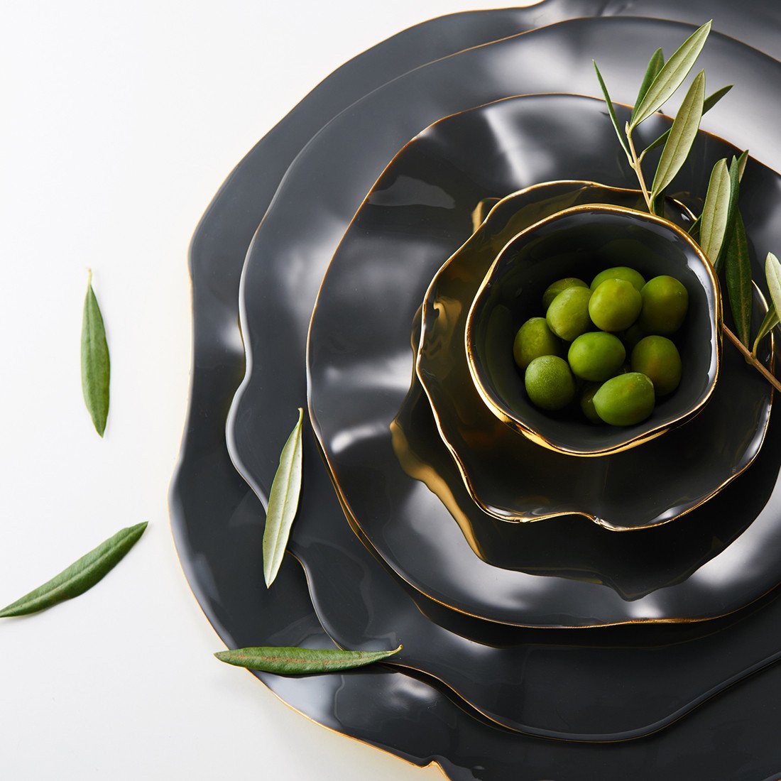 Skilled craftsmen hand apply a food safe enamel on the gold metal surface, giving it the fragile and delicate beauty of porcelain but it will never break. The dinnerware set include 3 Sizes- salad plate, dinner plate and charger.