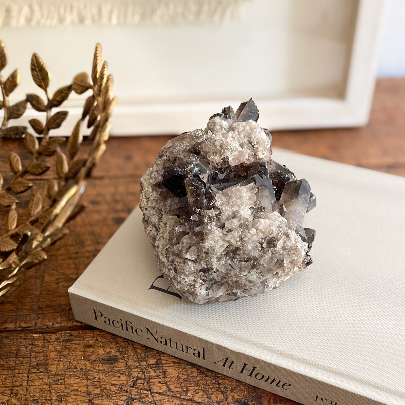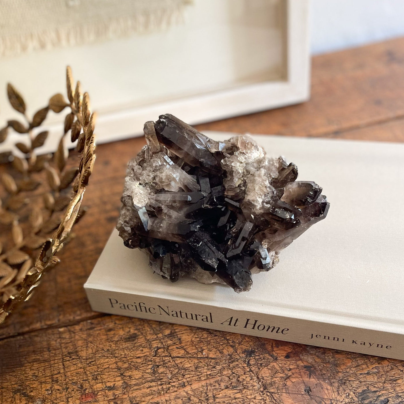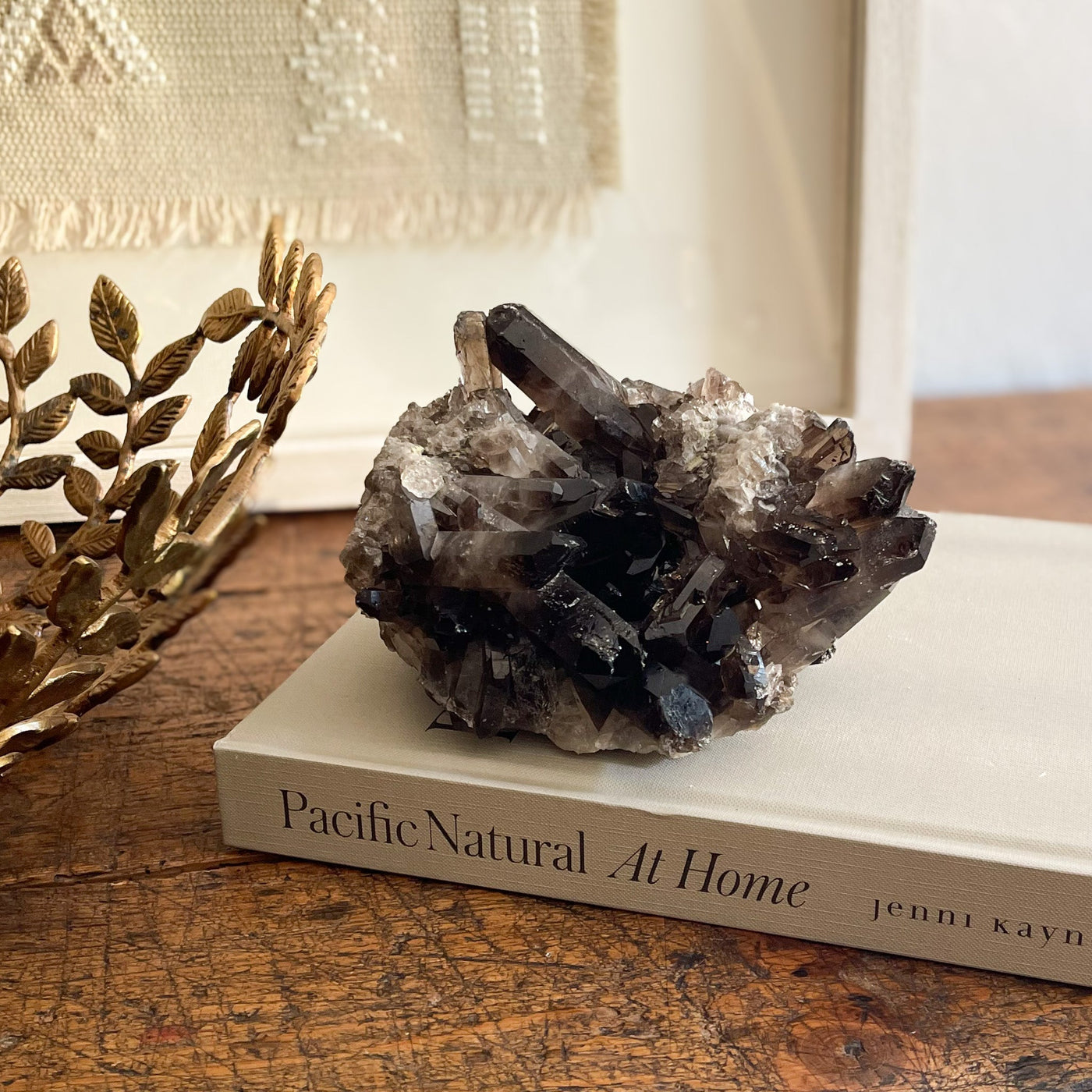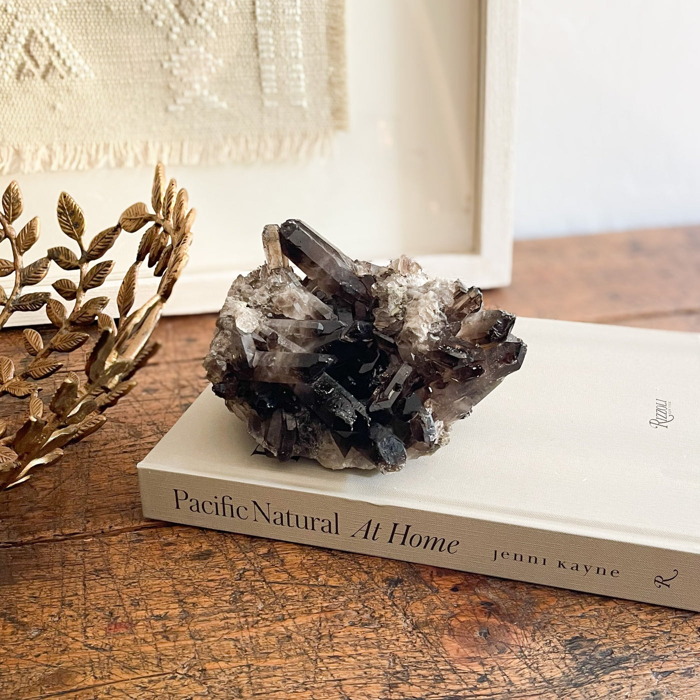 Unlock the beauty of the earth with this gorgeous smoky quartz crystal cluster. The striking texture of the crystals and the smoky hues, make this piece an exquisite addition to any space. Let this luxe cluster captivate you with its organic beauty and enjoy the soothing power of natural quartz.