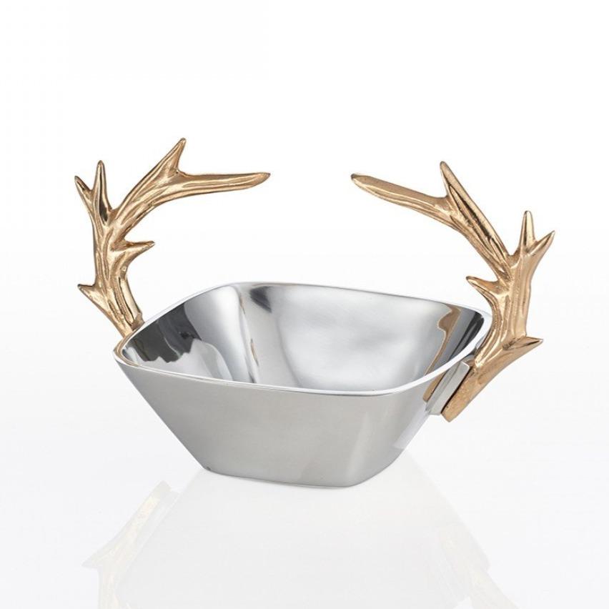 Branching forms are found everywhere in nature, inspiring this collection of antlers, trees, twigs and corals. The BRANCHES COLLECTION captures the essence of rustic modern style. Sculpted gleaming silver bowl with it's textured gold handles resembling stag horns, bring an English country lodge element, with its casual elegance. Use to serve nuts, dips or pudding.