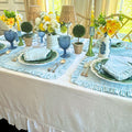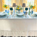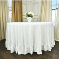 Delight in the effortlessly chic appeal of a white linen tablecloth with a ruffle border. Designed to have a large drop on your table. It's perfect for special occasions.