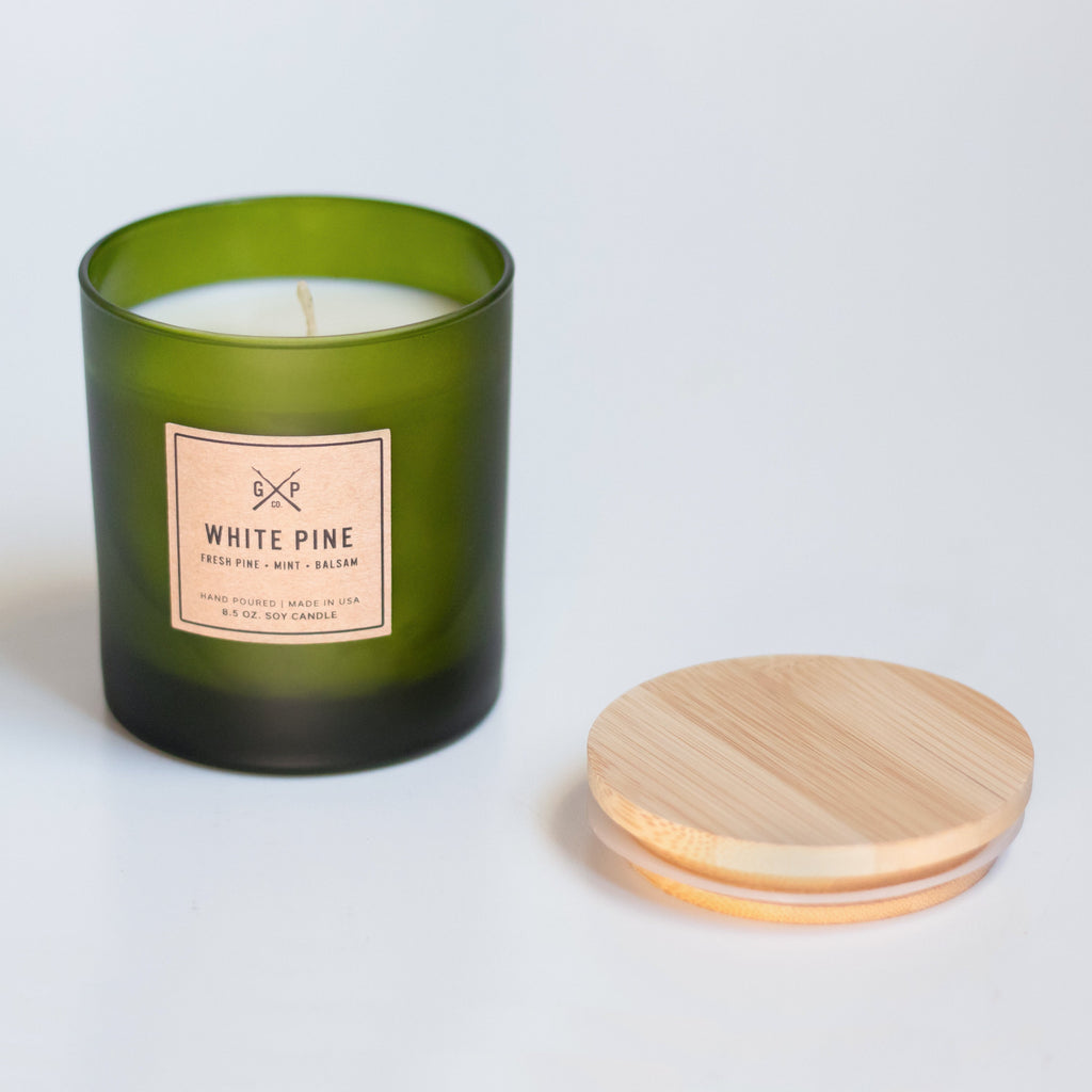 -8.5 oz. soy candle in a frosted green glass tumbler with a bamboo lid.